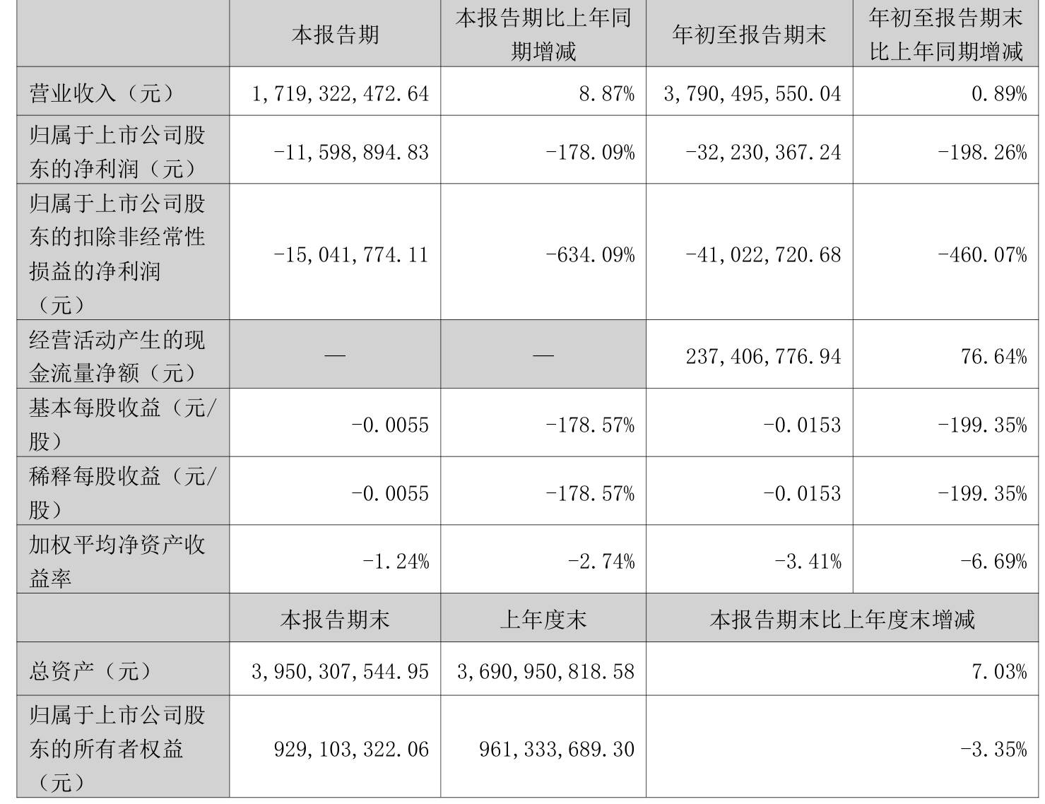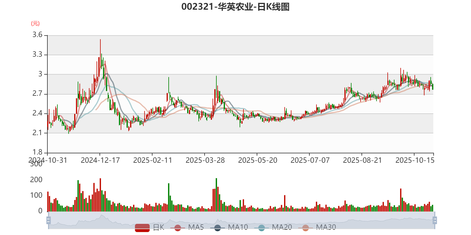 中证智能财讯华英农业(002321)10月31日披露2025年第三季度报告。前三季度公司实现营业总收入37.9亿元,同比增长0.89%;归母净利润亏损3223.04万元,上年同期盈利3279.96万元;扣非净利润亏损4102.27万元,上年同期盈利1139.31万元;经营活动产生的现金流量净额为2.37亿元,同比增长76.64%;报告期内,华英农业基本每股收益为-0.0153元,加权平均净资产收益率为-3.41%。