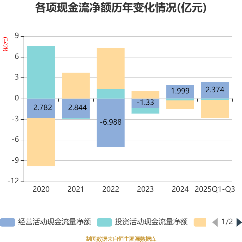 2025年前三季度,公司经营活动现金流净额为2.37亿元,同比增长76.64%;筹资活动现金流净额-2.64亿元,同比减少1.13亿元;投资活动现金流净额-1880.37万元,上年同期为-2620.2万元。
