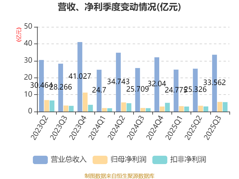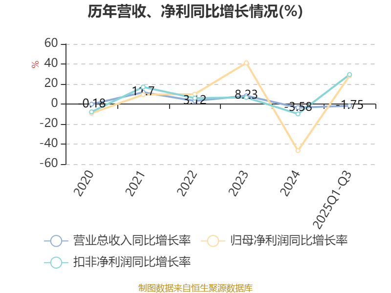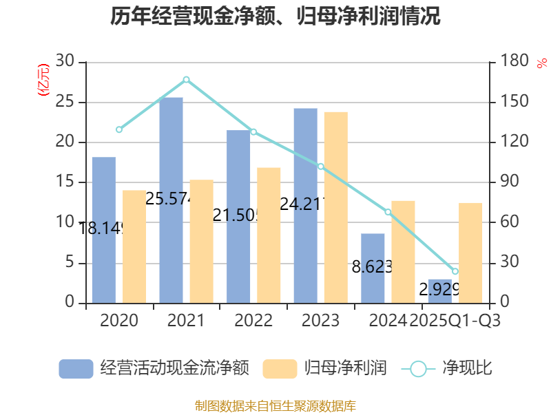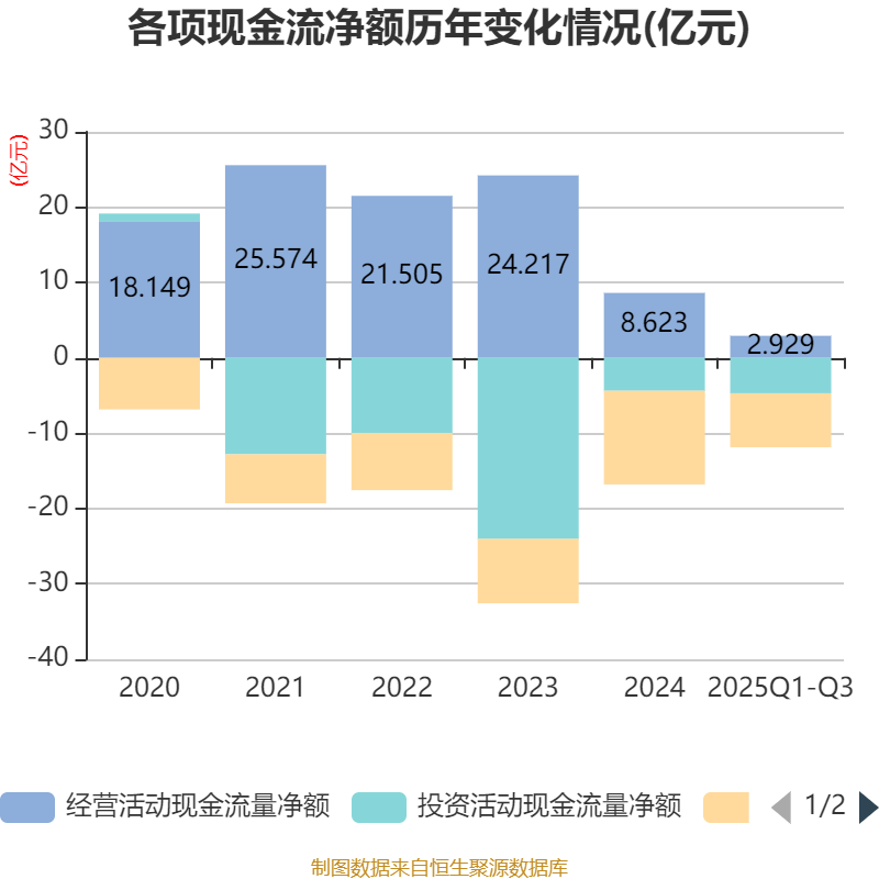 2025年前三季度,公司经营活动现金流净额为2.93亿元,同比下降46.51%;筹资活动现金流净额-7.17亿元,同比增加4.58亿元;投资活动现金流净额-4.7亿元,上年同期为-1.68亿元。