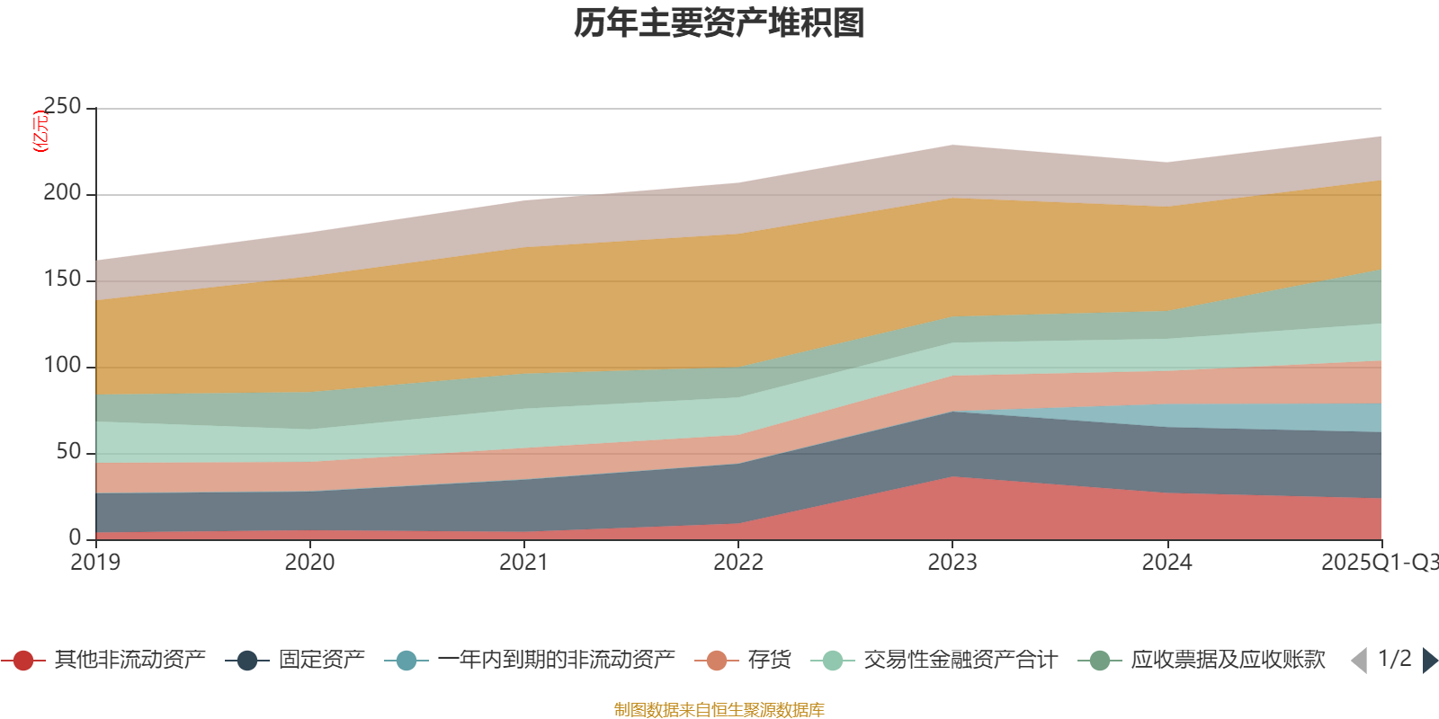 资产重大变化方面,截至2025年三季度末,公司应收票据及应收账款较上年末增加94.96%,占公司总资产比重上升6.08个百分点;货币资金较上年末减少14.7%,占公司总资产比重下降5.59个百分点;其他非流动资产较上年末减少11.83%,占公司总资产比重下降2.15个百分点;存货较上年末增加29.68%,占公司总资产比重上升1.87个百分点。