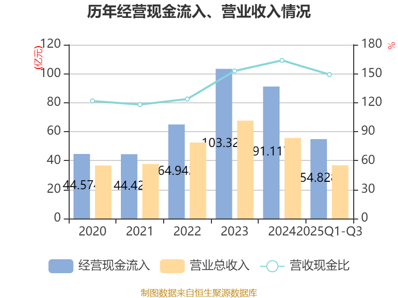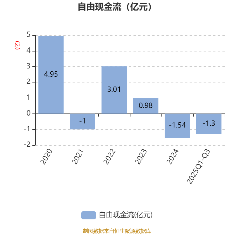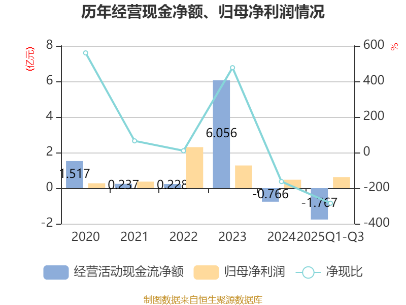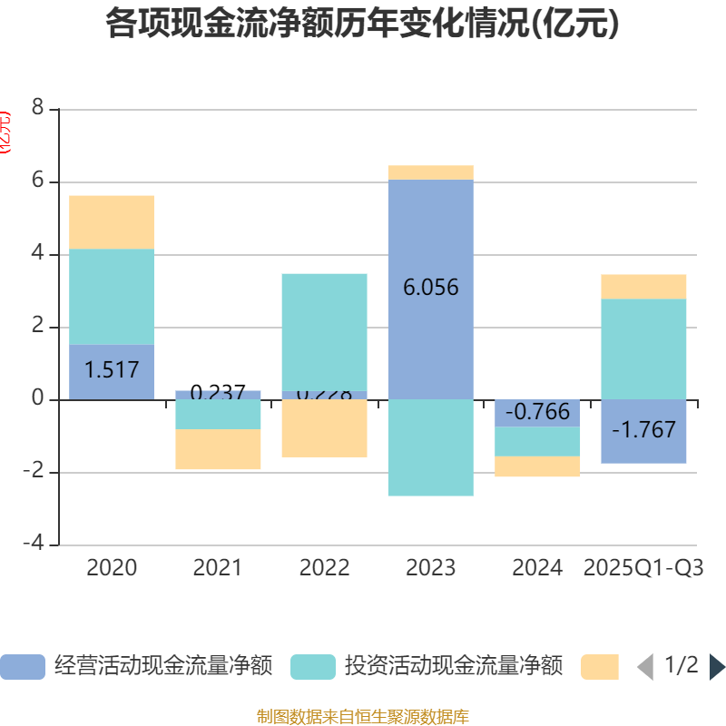 2025年前三季度,公司经营活动现金流净额为-1.77亿元,同比增加6983.27万元;筹资活动现金流净额6685.31万元,同比减少494.45万元;投资活动现金流净额2.77亿元,上年同期为-3870.64万元。