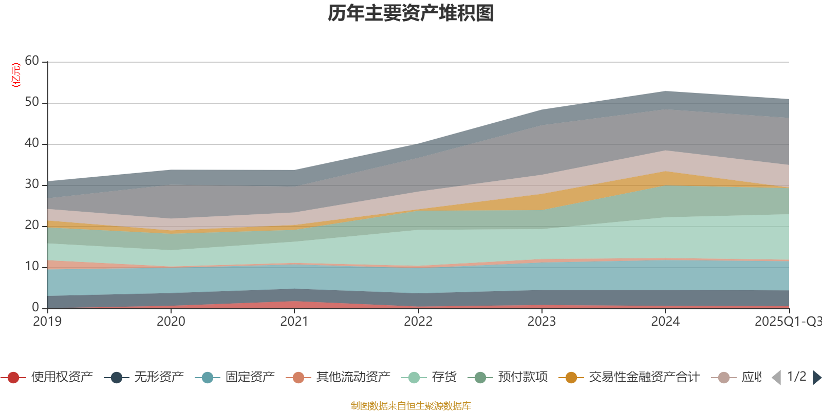 资产重大变化方面,截至2025年三季度末,公司交易性金融资产合计较上年末减少95.15%,占公司总资产比重下降6.27个百分点;货币资金较上年末增加14.37%,占公司总资产比重上升3.54个百分点;存货较上年末增加11.78%,占公司总资产比重上升3.01个百分点;预付款项较上年末减少18.16%,占公司总资产比重下降2.2个百分点。