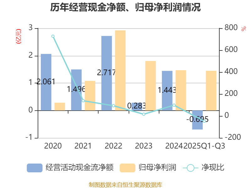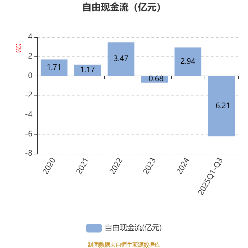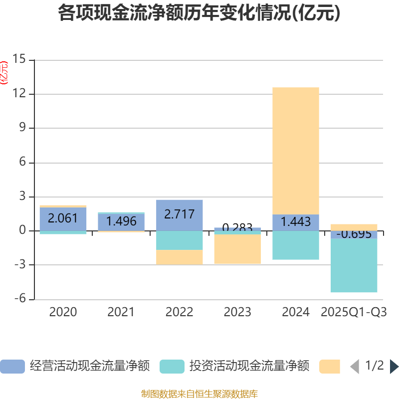 2025年前三季度,公司经营活动现金流净额为-6945.4万元,同比减少1.3亿元;筹资活动现金流净额5835.59万元,同比减少7689.83万元;投资活动现金流净额-4.7亿元,上年同期为-2.29亿元。