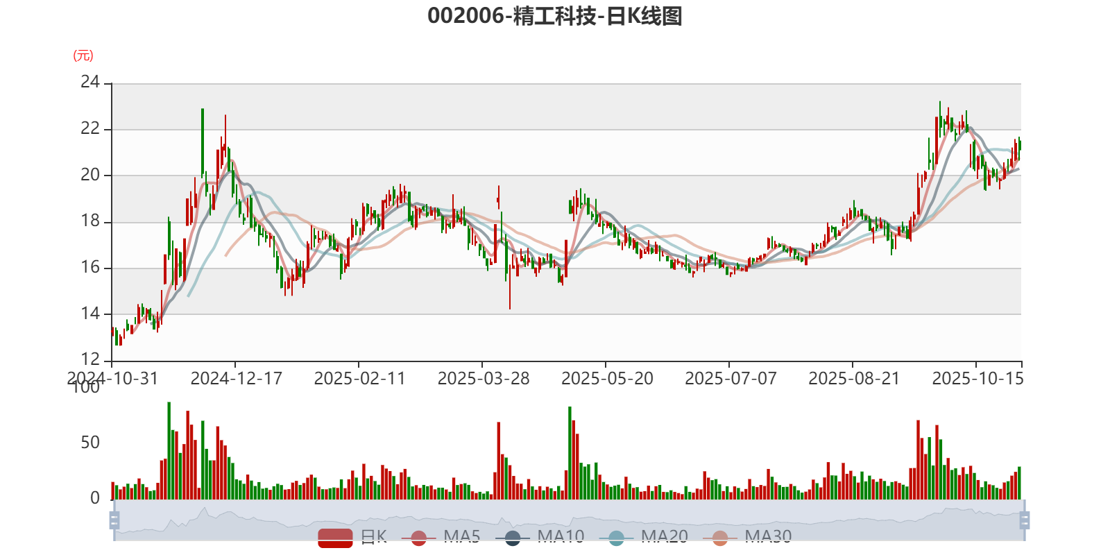 以10月30日收盘价计算,精工科技目前市盈率(TTM)约为50.23倍,市净率(LF)约4.57倍,市销率(TTM)约5.81倍。
