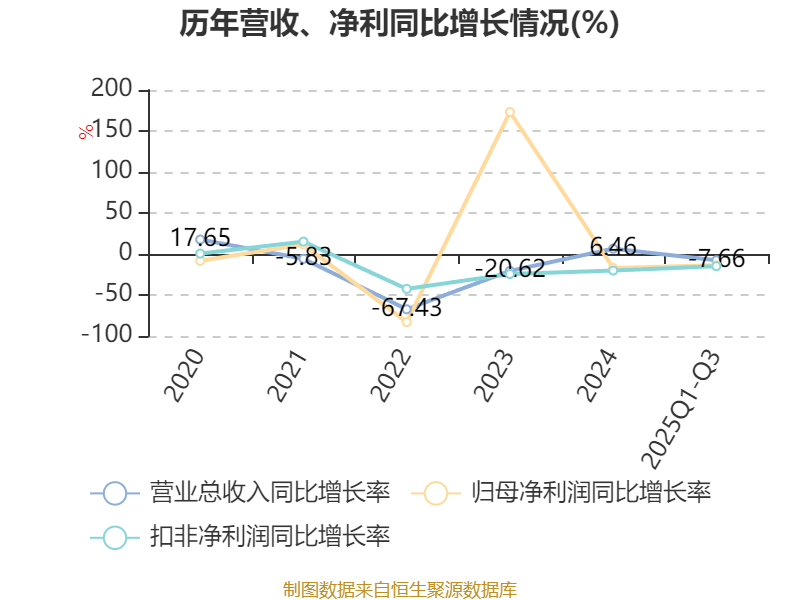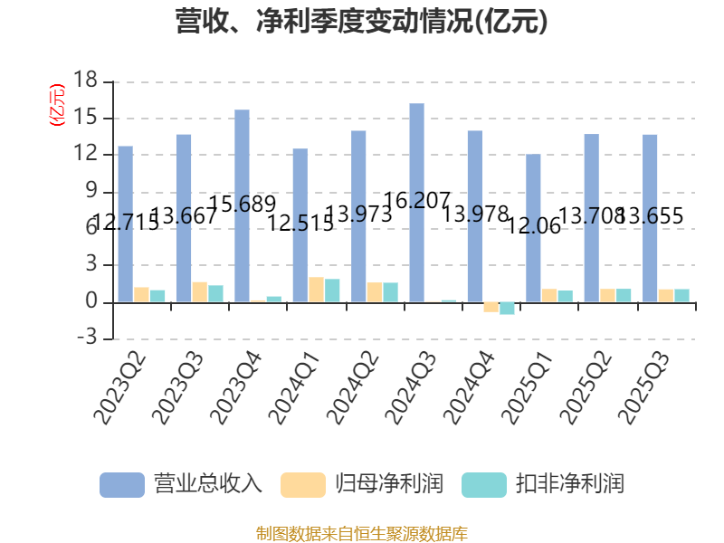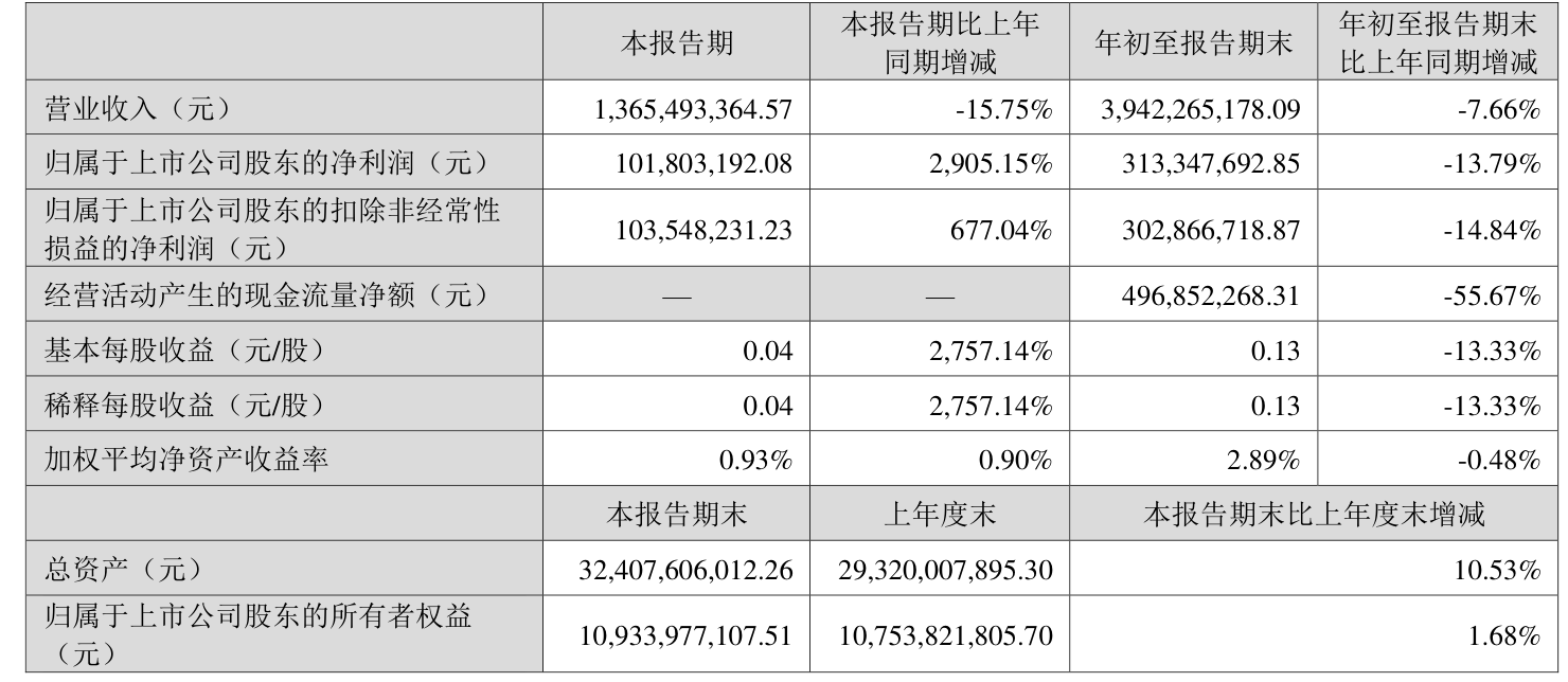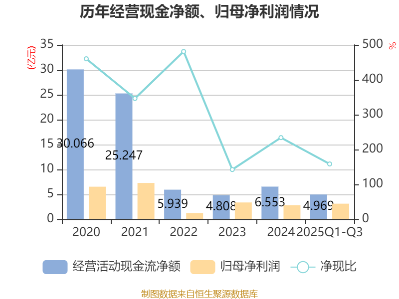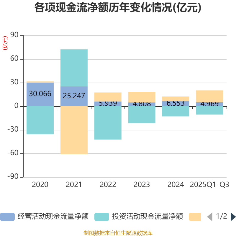 2025年前三季度,公司经营活动现金流净额为4.97亿元,同比下降55.67%;筹资活动现金流净额15.14亿元,同比增加7.68亿元;投资活动现金流净额-10.65亿元,上年同期为-17.86亿元。
