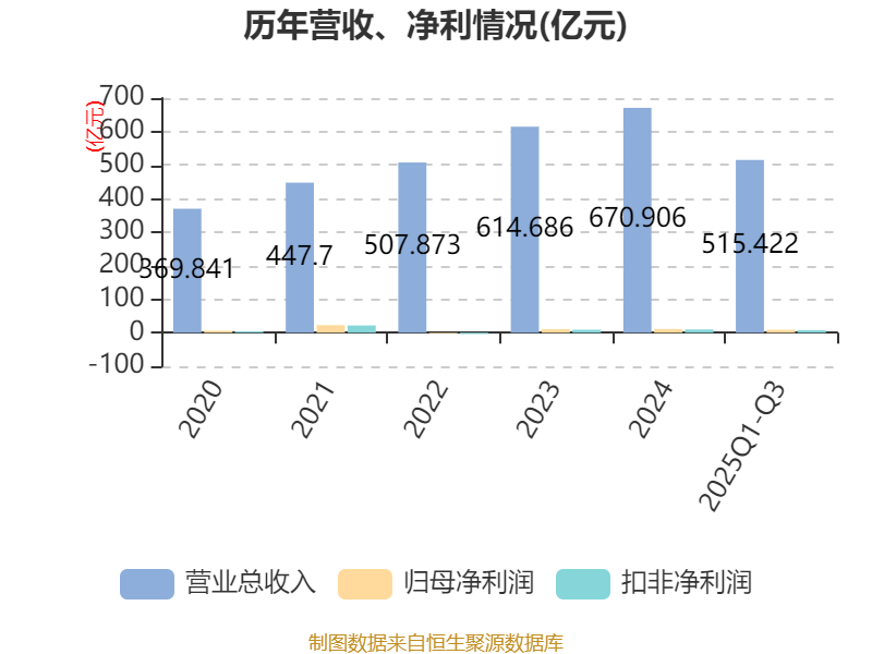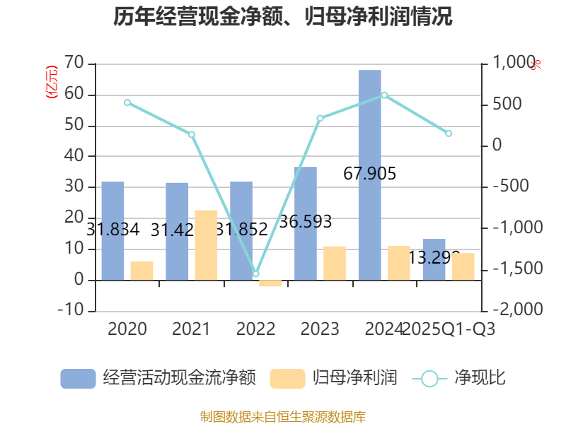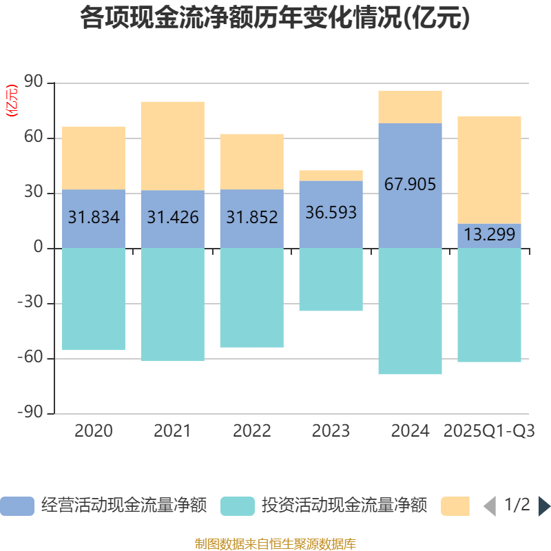 2025年前三季度,公司经营活动现金流净额为13.3亿元,同比下降67.44%;筹资活动现金流净额58.36亿元,同比增加23.79亿元;投资活动现金流净额-62.1亿元,上年同期为-52.96亿元。