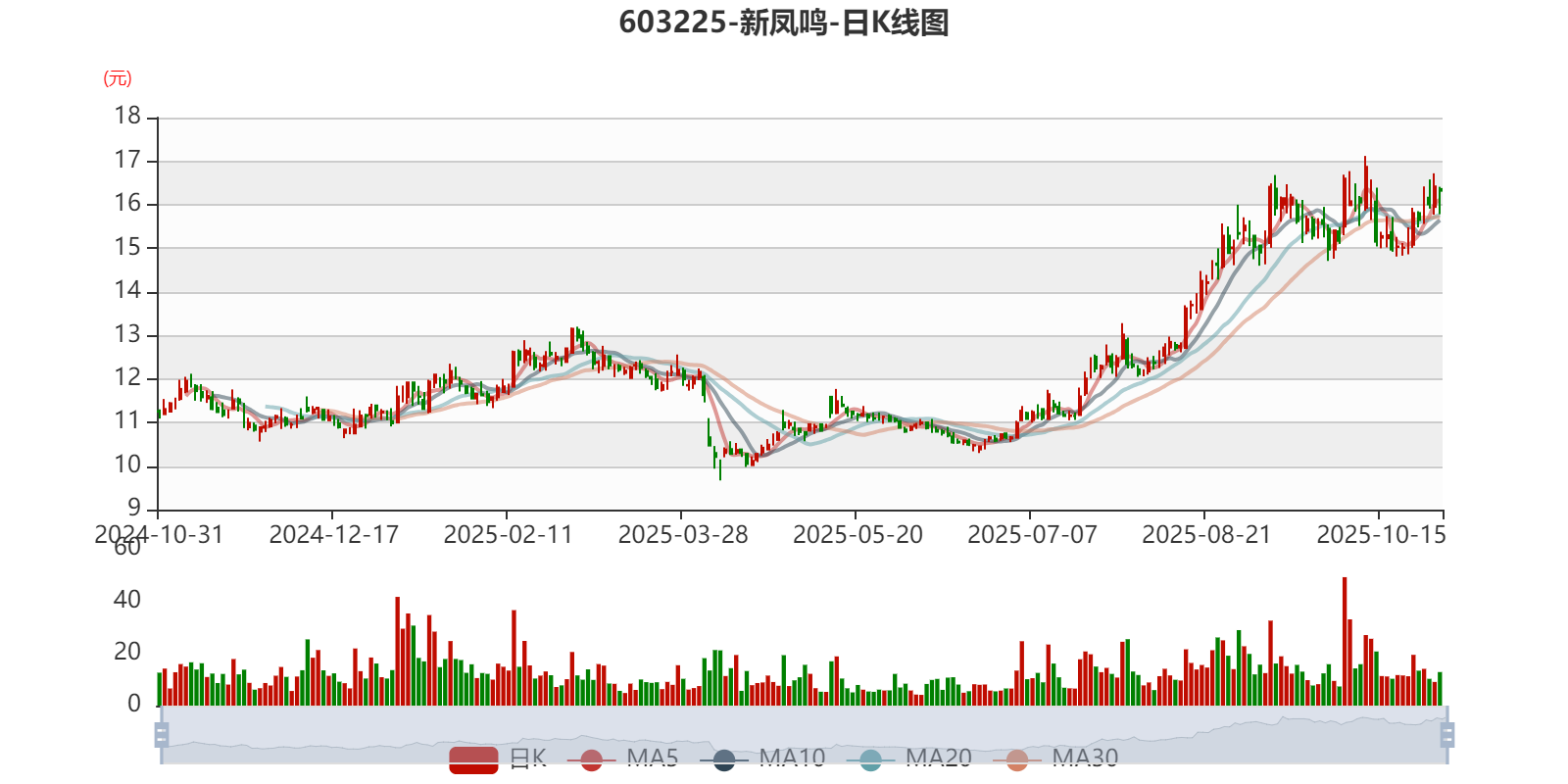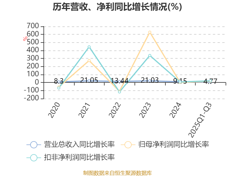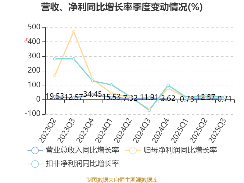 中证智能财讯新凤鸣(603225)10月31日披露2025年第三季度报告。前三季度公司实现营业总收入515.42亿元,同比增长4.77%;归母净利润8.69亿元,同比增长16.56%;扣非净利润7.76亿元,同比增长21.76%;经营活动产生的现金流量净额为13.3亿元,同比下降67.44%;报告期内,新凤鸣基本每股收益为0.58元,加权平均净资产收益率为4.92%。