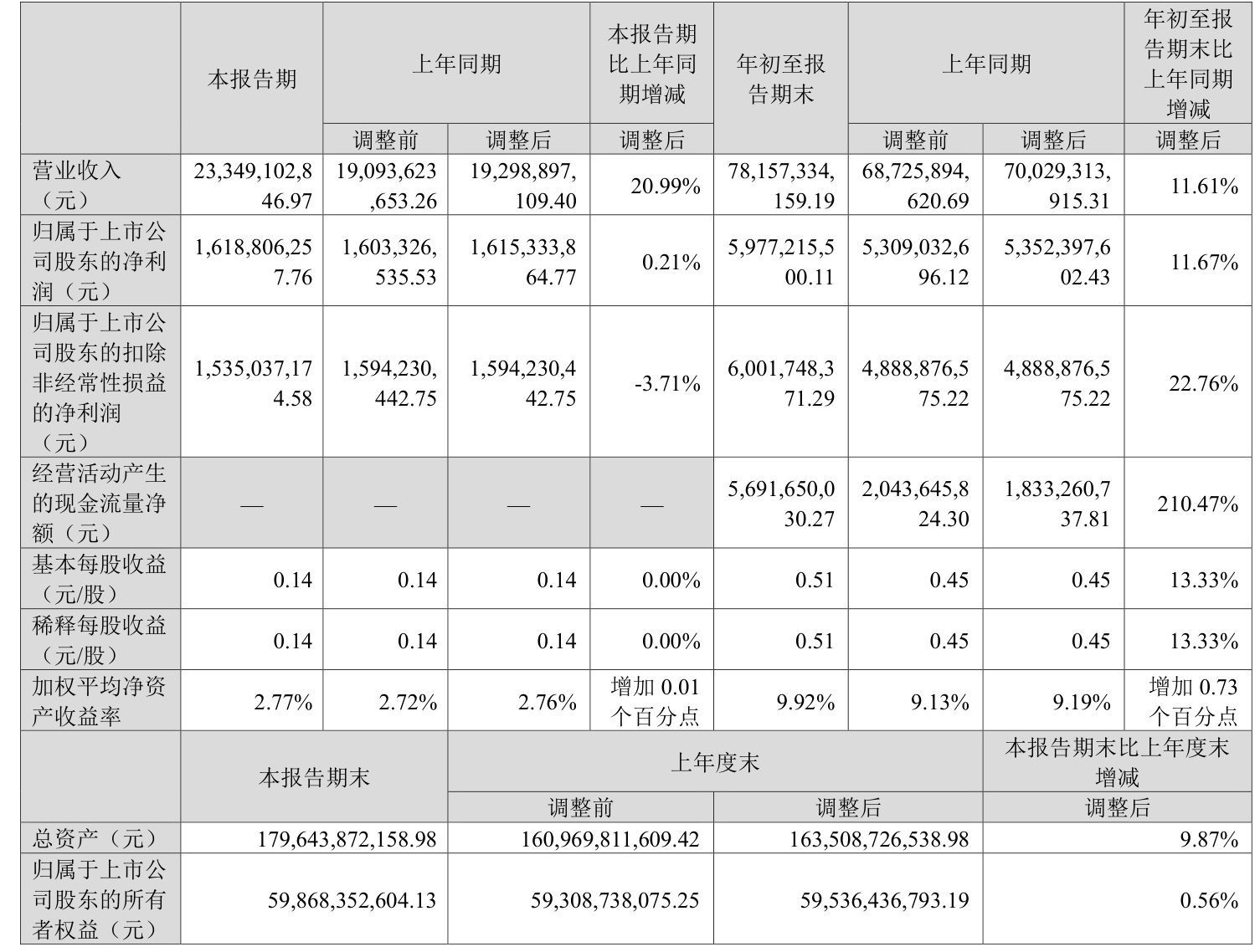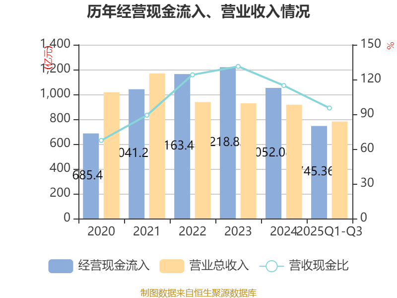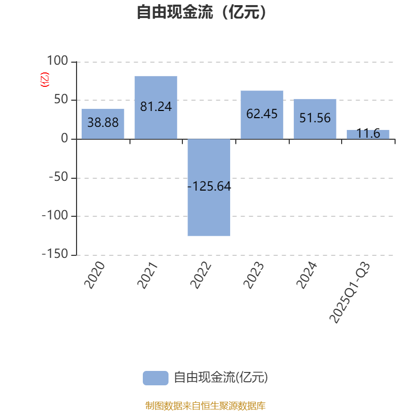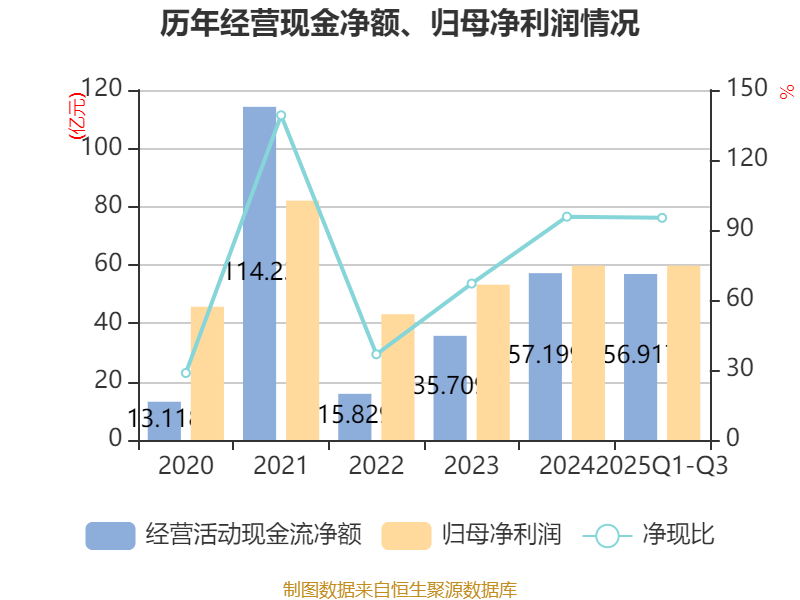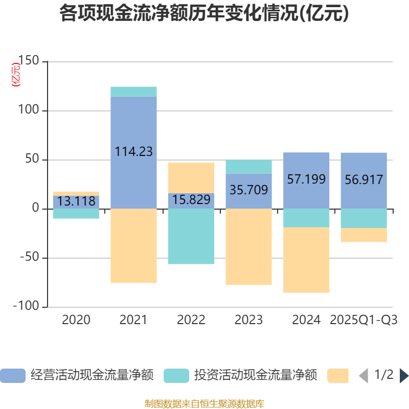 2025年前三季度,公司经营活动现金流净额为56.92亿元,同比增长210.47%;筹资活动现金流净额-14.19亿元,同比减少5579.51万元;投资活动现金流净额-19.82亿元,上年同期为-21.24亿元。