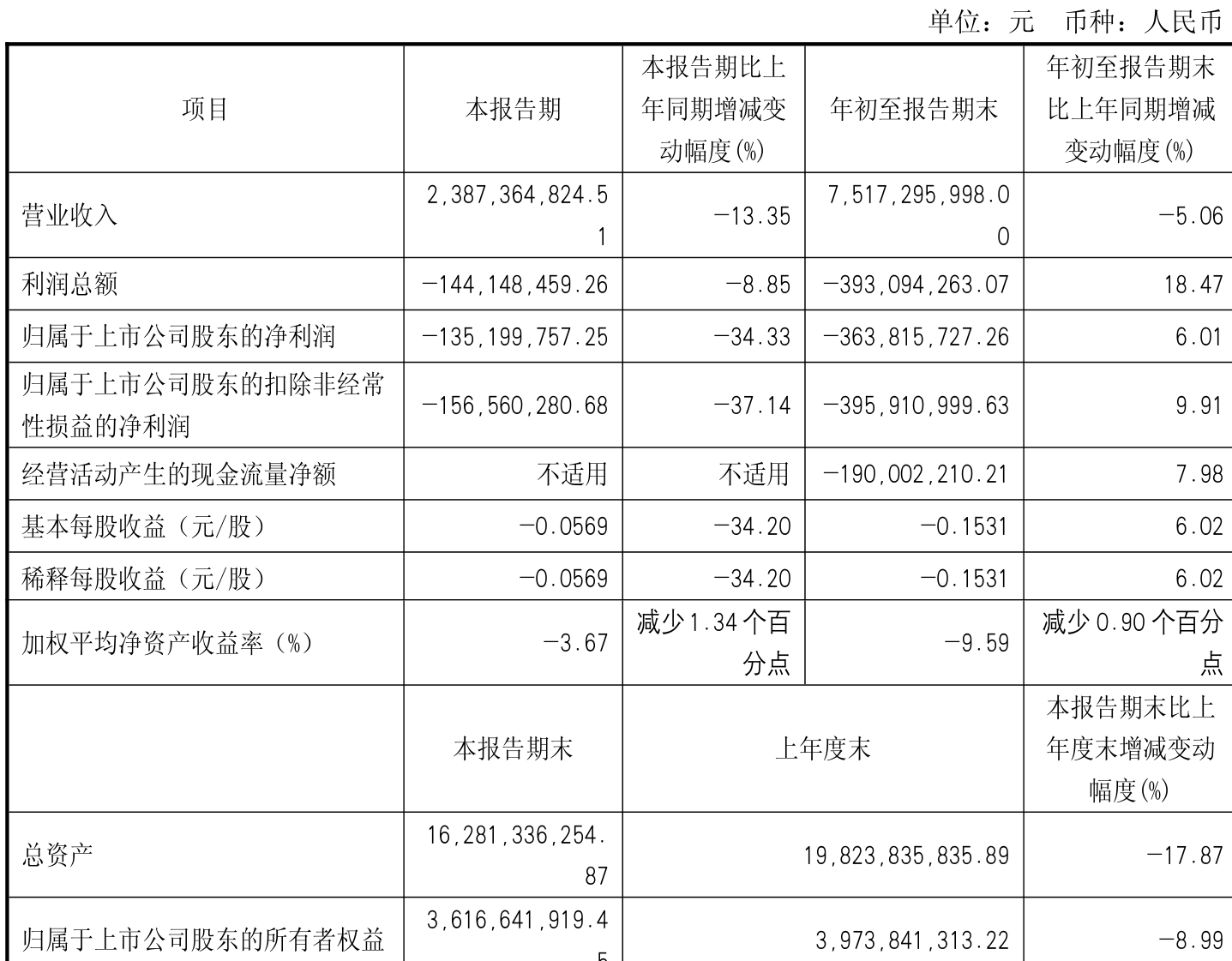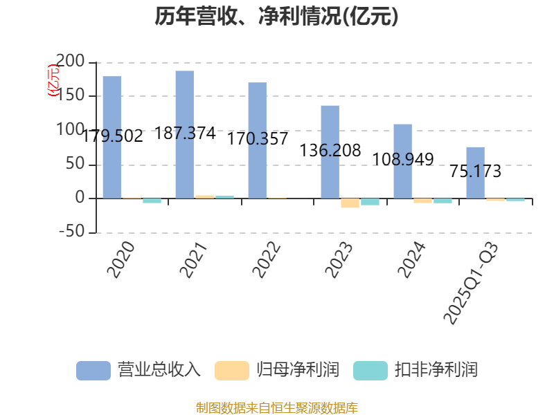 中证智能财讯潞化科技(600691)10月31日披露2025年第三季度报告。前三季度公司实现营业总收入75.17亿元,同比下降5.06%;归母净利润亏损3.64亿元,上年同期亏损3.87亿元;扣非净利润亏损3.96亿元,上年同期亏损4.39亿元;经营活动产生的现金流量净额为-1.9亿元,上年同期为-2.06亿元;报告期内,潞化科技基本每股收益为-0.1531元,加权平均净资产收益率为-9.59%。