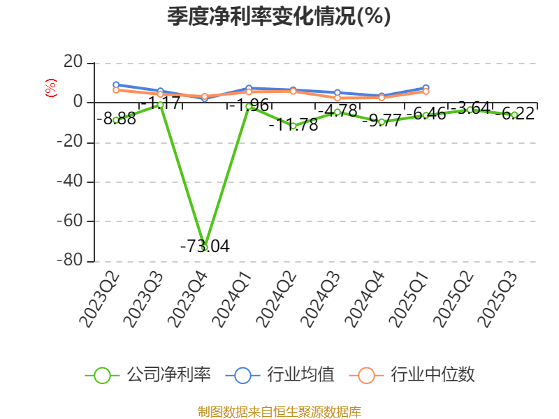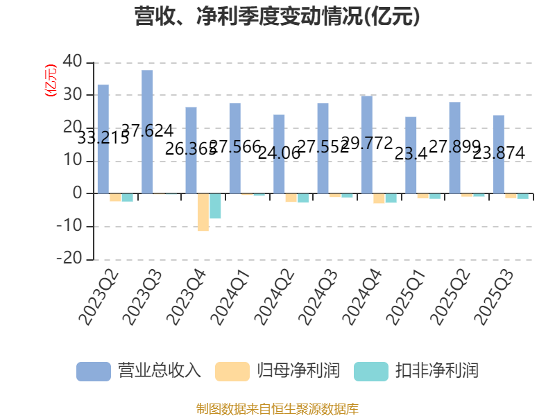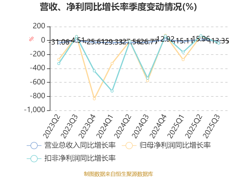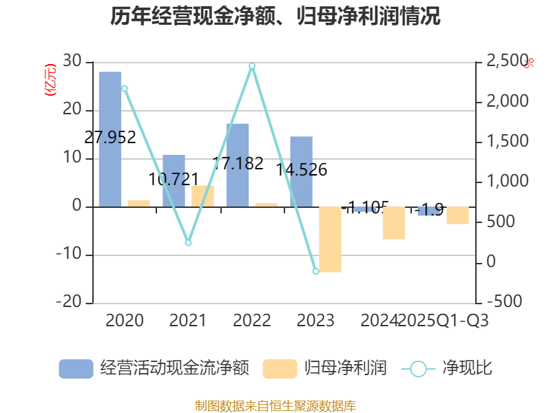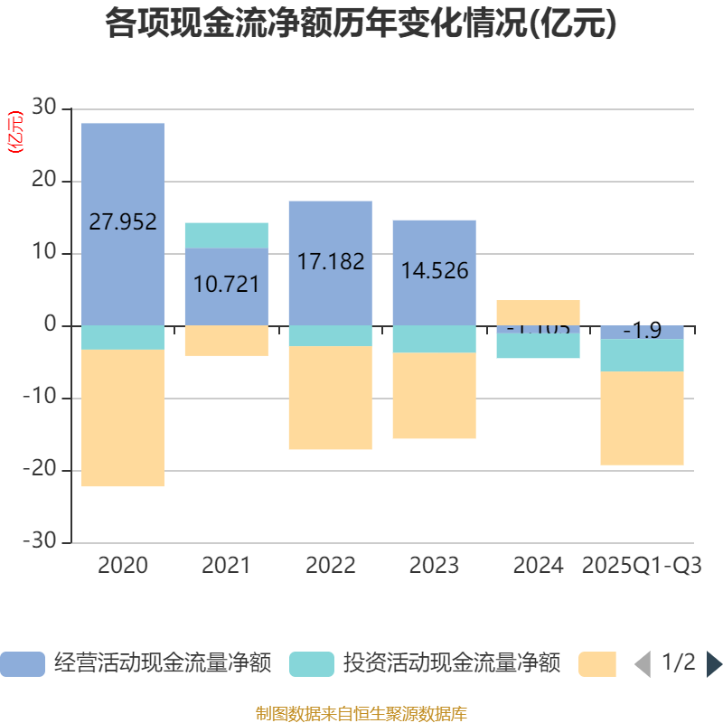 2025年前三季度,公司经营活动现金流净额为-1.9亿元,同比增加1647.55万元;筹资活动现金流净额-12.96亿元,同比减少9.07亿元;投资活动现金流净额-4.49亿元,上年同期为-1.88亿元。