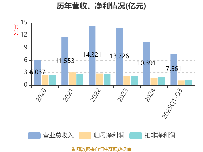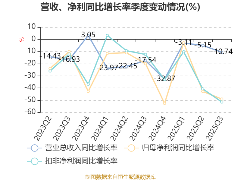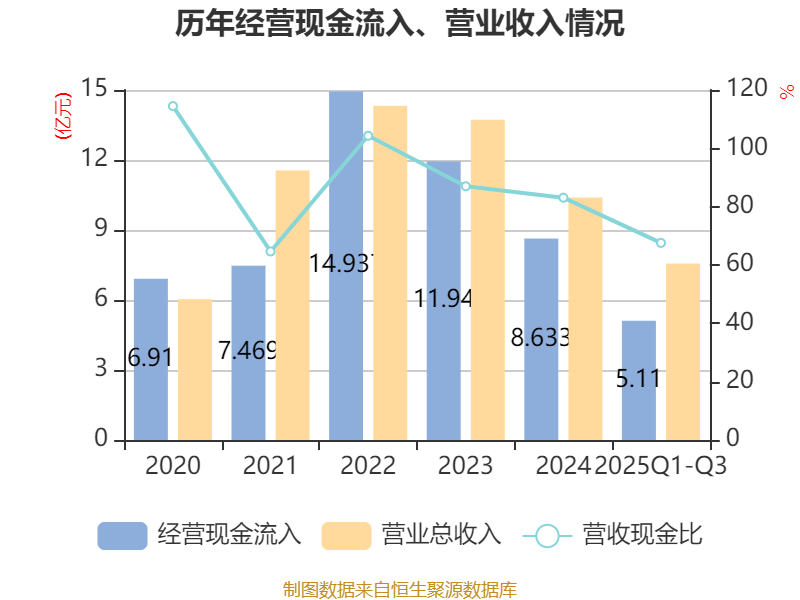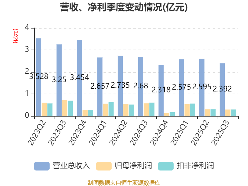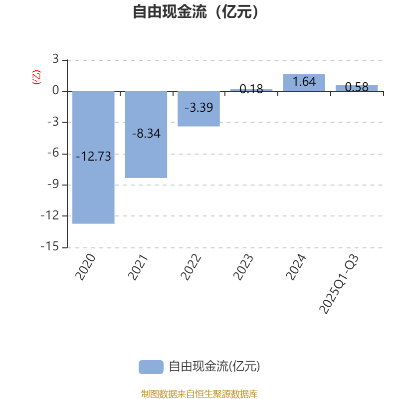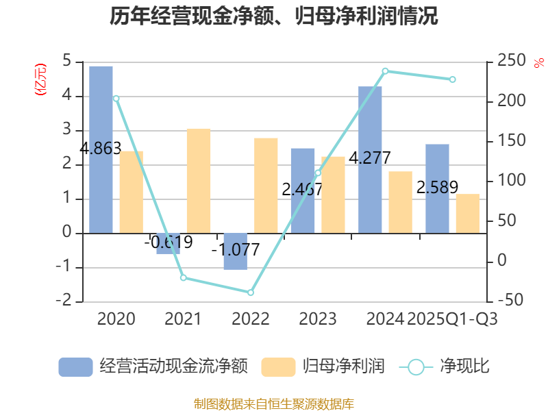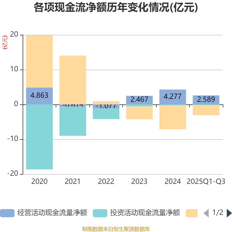 2025年前三季度,公司经营活动现金流净额为2.59亿元,同比增长14.79%;筹资活动现金流净额-3亿元,同比减少270.3万元;投资活动现金流净额-1145.13万元,上年同期为-2028.03万元。