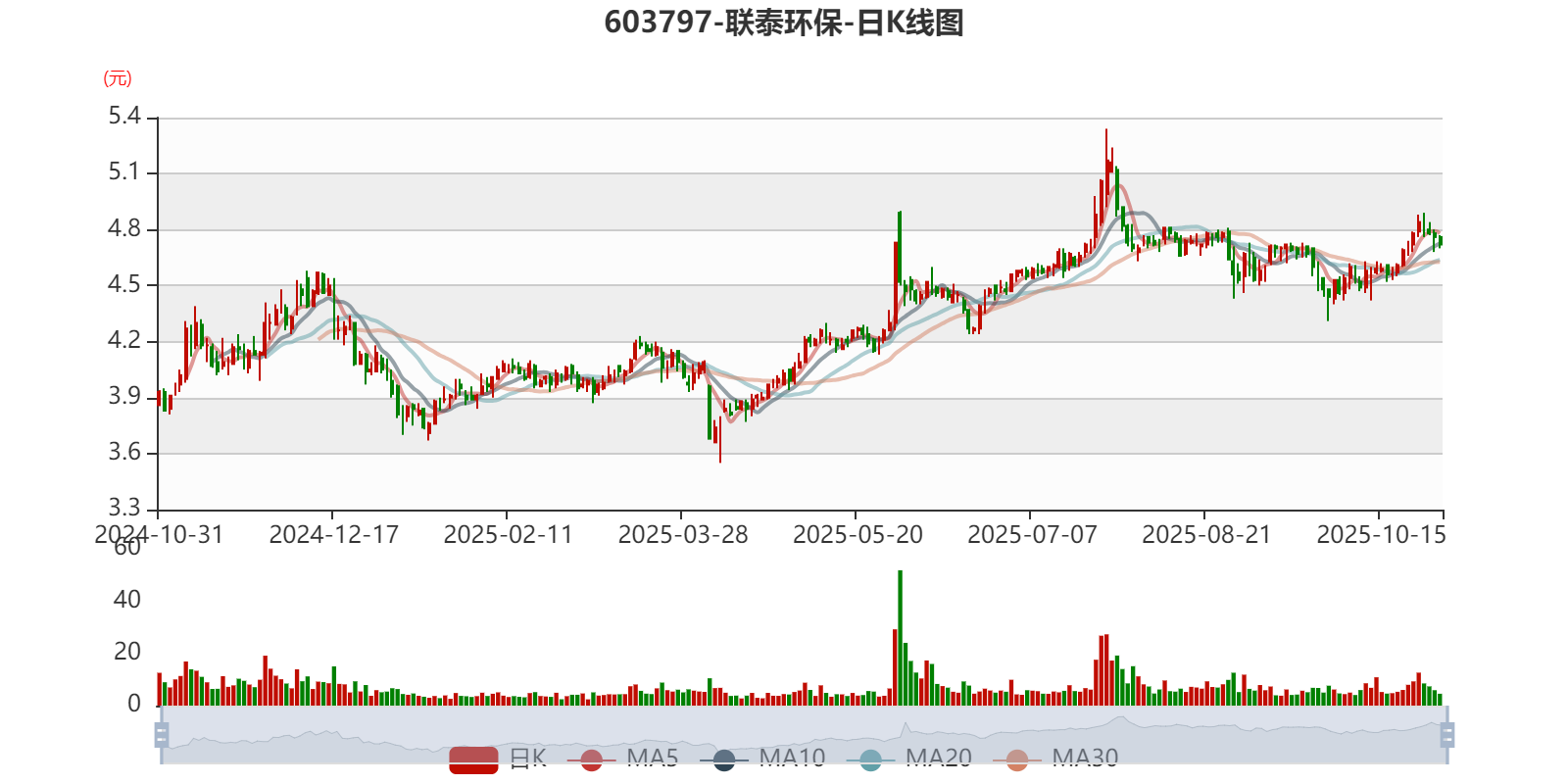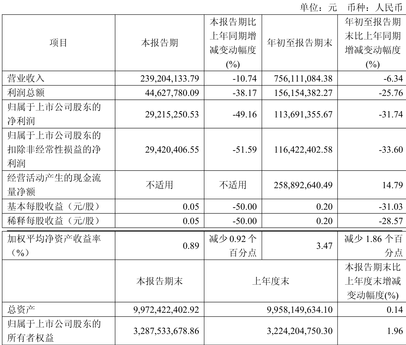 中证智能财讯联泰环保(603797)10月31日披露2025年第三季度报告。前三季度公司实现营业总收入7.56亿元,同比下降6.34%;归母净利润1.14亿元,同比下降31.74%;扣非净利润1.16亿元,同比下降33.60%;经营活动产生的现金流量净额为2.59亿元,同比增长14.79%;报告期内,联泰环保基本每股收益为0.2元,加权平均净资产收益率为3.47%。