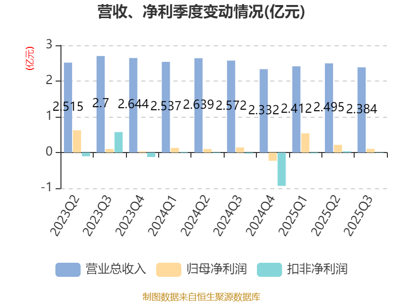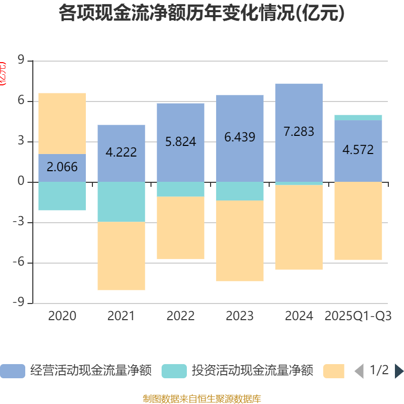 2025年前三季度,公司经营活动现金流净额为4.57亿元,同比下降14.78%;筹资活动现金流净额-5.8亿元,同比减少1.04亿元;投资活动现金流净额3880.22万元,上年同期为4443.48万元。