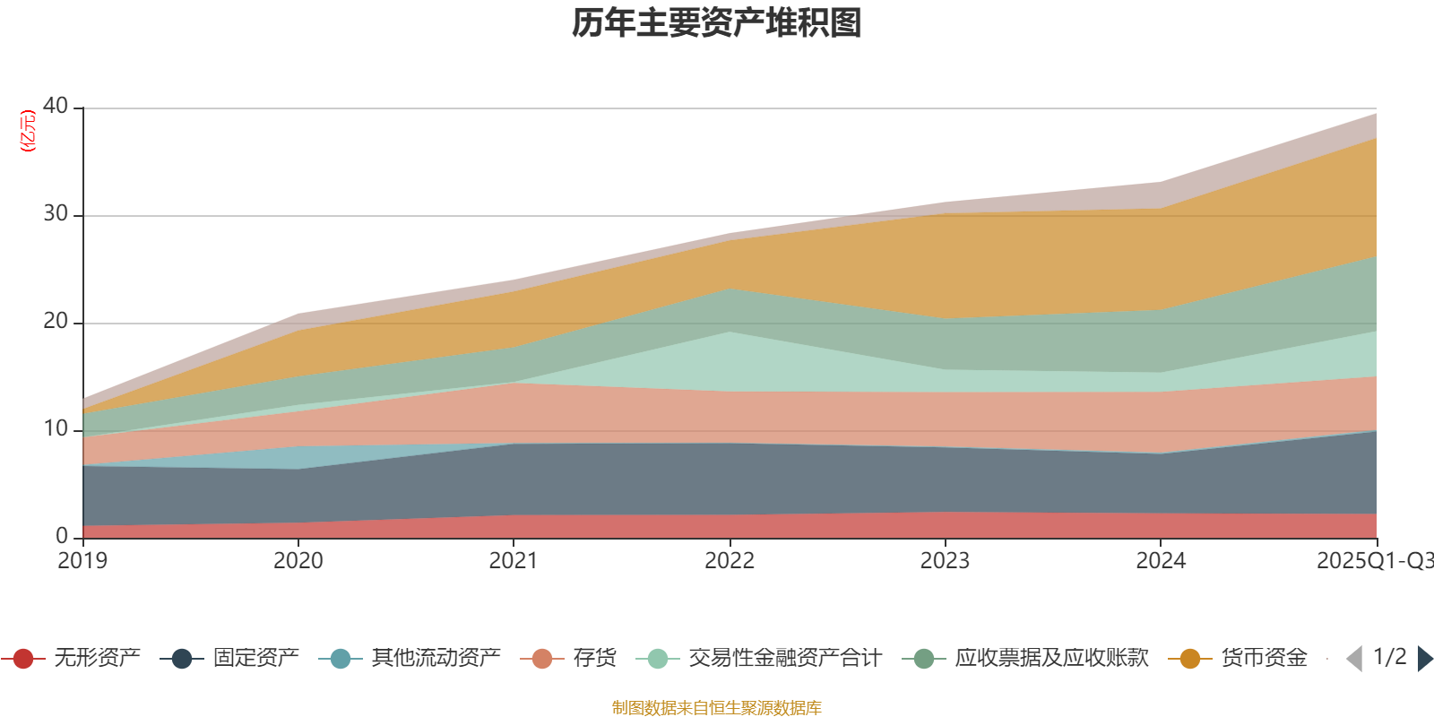资产重大变化方面,截至2025年三季度末,公司交易性金融资产合计较上年末增加133.4%,占公司总资产比重上升5.21个百分点;存货较上年末减少11.85%,占公司总资产比重下降4.46个百分点;在建工程合计较上年末减少77.25%,占公司总资产比重下降3.21个百分点;固定资产较上年末增加39.12%,占公司总资产比重上升2.77个百分点。