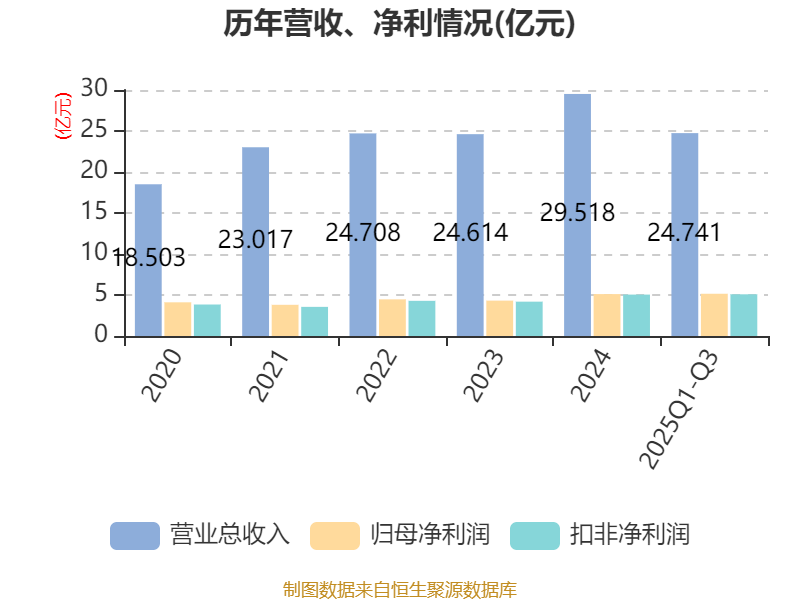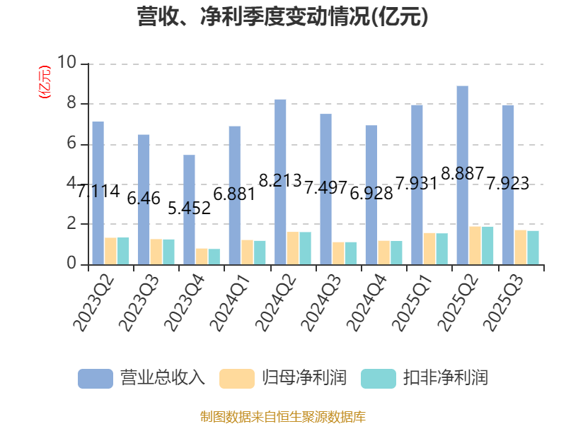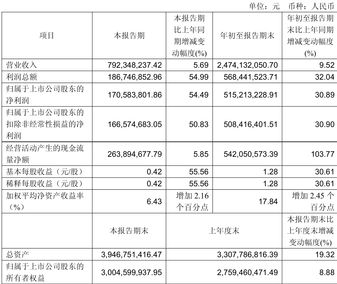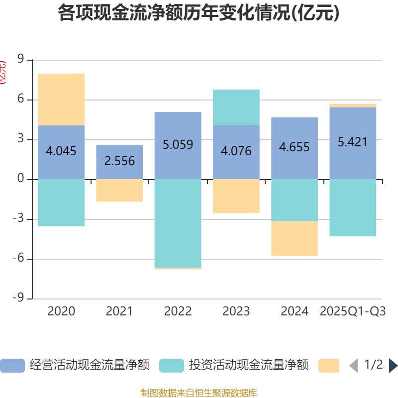 2025年前三季度,公司经营活动现金流净额为5.42亿元,同比增长103.77%;筹资活动现金流净额2394.48万元,同比增加3.3亿元;投资活动现金流净额-4.32亿元,上年同期为-1665.33万元。