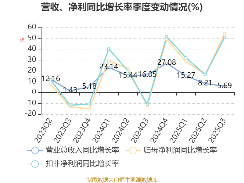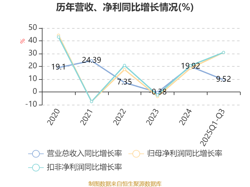 中证智能财讯共创草坪(605099)10月31日披露2025年第三季度报告。前三季度公司实现营业总收入24.74亿元,同比增长9.52%;归母净利润5.15亿元,同比增长30.89%;扣非净利润5.08亿元,同比增长30.90%;经营活动产生的现金流量净额为5.42亿元,同比增长103.77%;报告期内,共创草坪基本每股收益为1.28元,加权平均净资产收益率为17.84%。