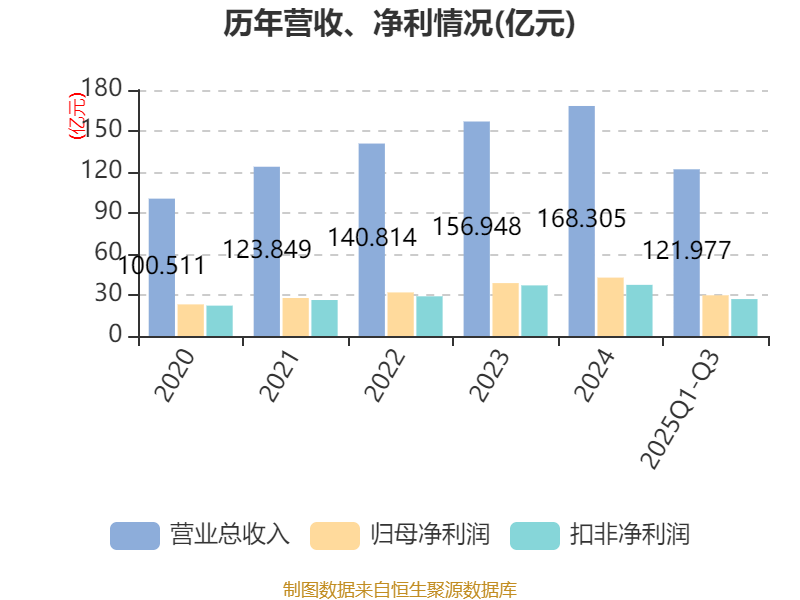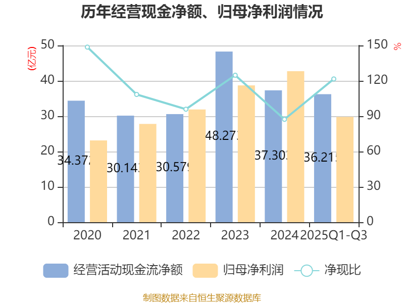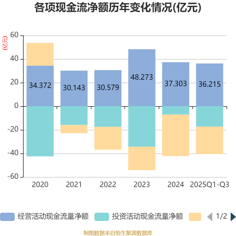 2025年前三季度,公司经营活动现金流净额为36.21亿元,同比增长20.12%;筹资活动现金流净额-23.22亿元,同比增加13.02亿元;投资活动现金流净额-17.34亿元,上年同期为3.97亿元。