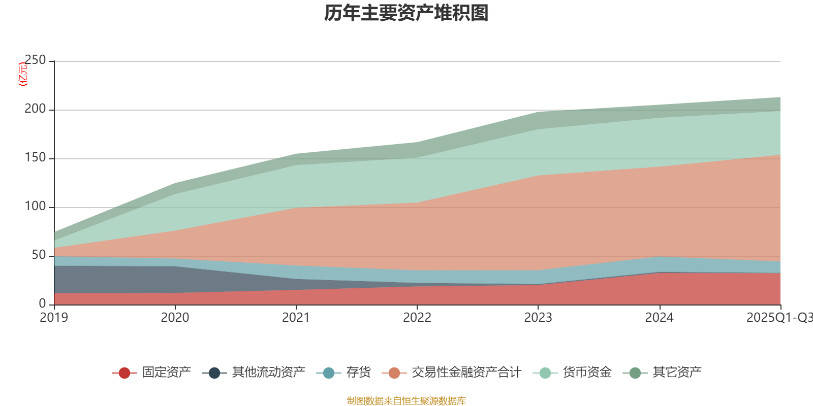 资产重大变化方面,截至2025年三季度末,公司交易性金融资产合计较上年末增加18.79%,占公司总资产比重上升6.49个百分点;货币资金较上年末减少10.73%,占公司总资产比重下降3.43个百分点;存货较上年末减少25.78%,占公司总资产比重下降2.19个百分点;固定资产较上年末减少0.63%,占公司总资产比重下降0.67个百分点。
