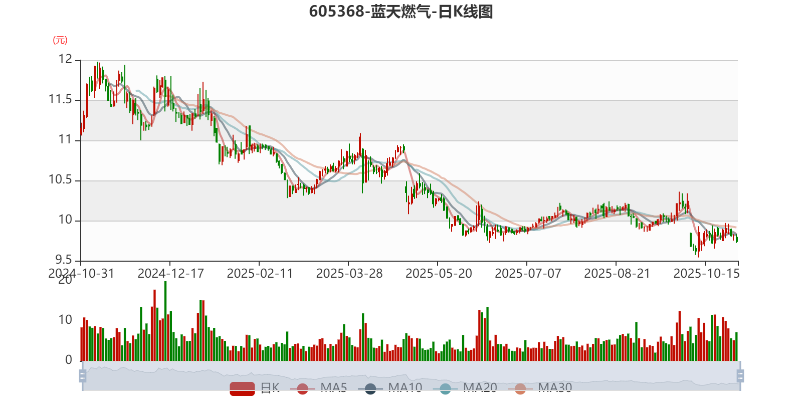 中证智能财讯蓝天燃气(605368)10月31日披露2025年第三季度报告。前三季度公司实现营业总收入30.46亿元,同比下降14.95%;归母净利润2.62亿元,同比下降41.95%;扣非净利润2.56亿元,同比下降41.53%;经营活动产生的现金流量净额为1.95亿元,同比下降31.89%;报告期内,蓝天燃气基本每股收益为0.3668元,加权平均净资产收益率为7.18%。