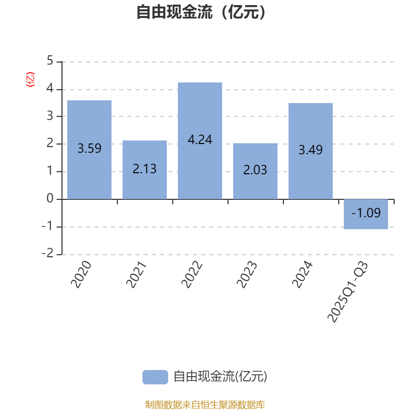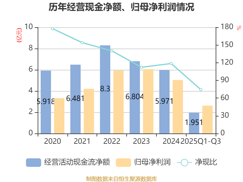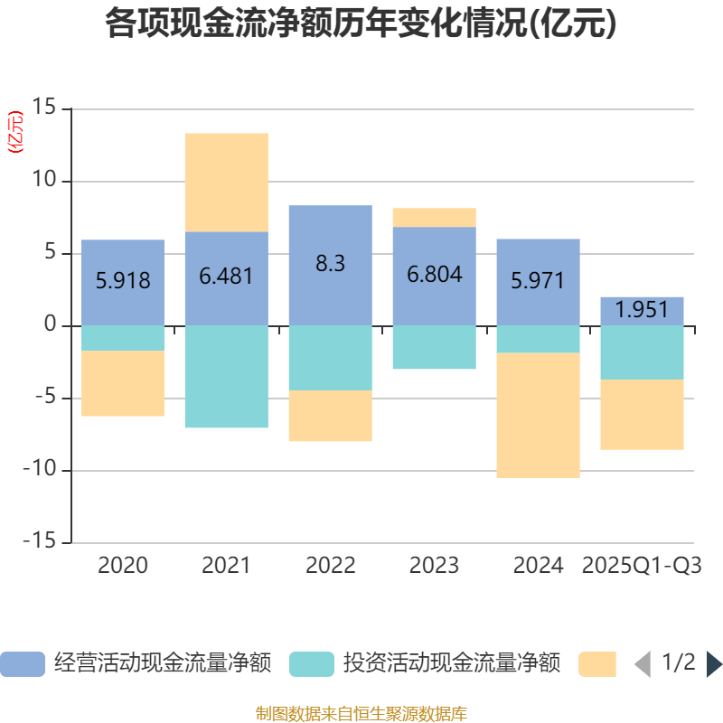 2025年前三季度,公司经营活动现金流净额为1.95亿元,同比下降31.89%;筹资活动现金流净额-4.86亿元,同比增加4.48亿元;投资活动现金流净额-3.75亿元,上年同期为-1.06亿元。