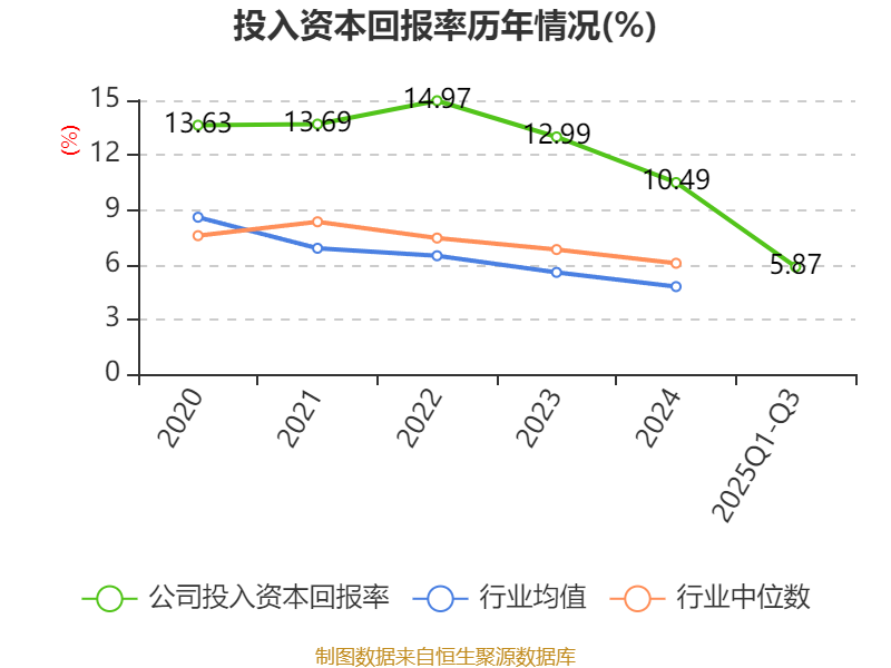 盈利能力方面, 2025年前三季度公司加权平均净资产收益率为7.18%,同比下降5.83个百分点。公司2025年前三季度投入资本回报率为5.87%,较上年同期下降3.6个百分点。