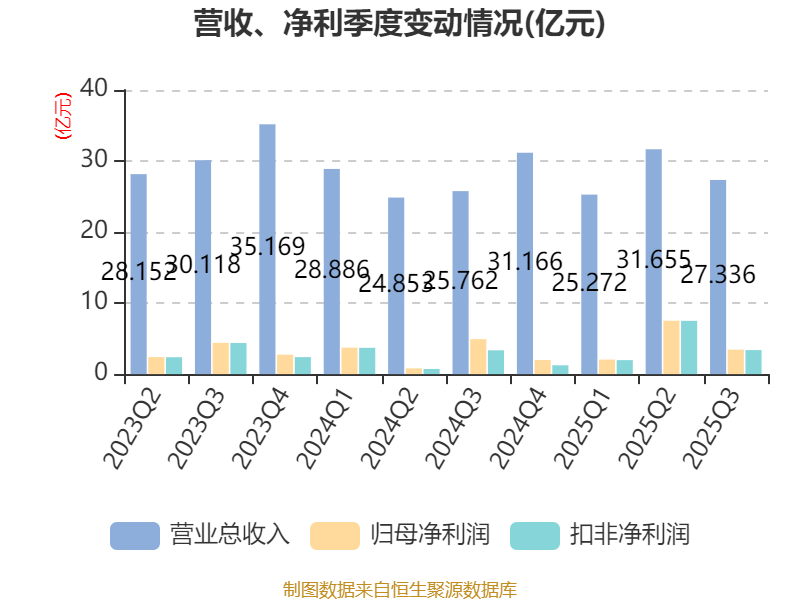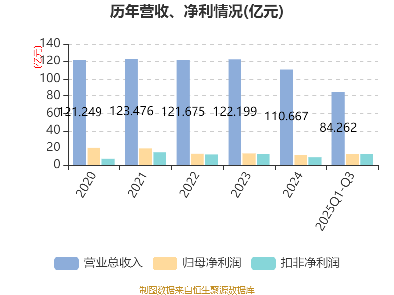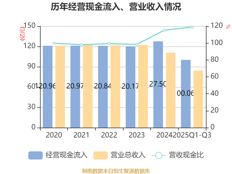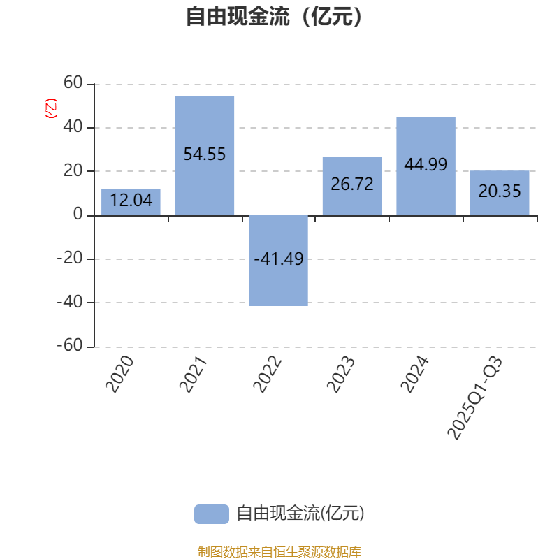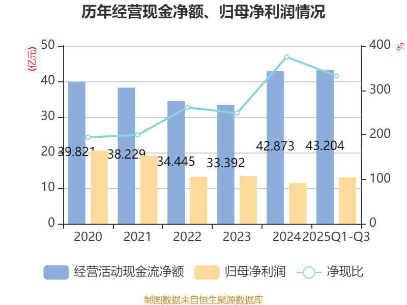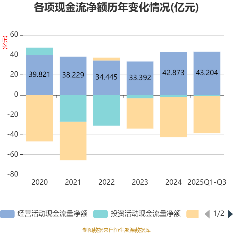 2025年前三季度,公司经营活动现金流净额为43.2亿元,同比增长83.4%;筹资活动现金流净额-37.43亿元,同比减少3.72亿元;投资活动现金流净额-1亿元,上年同期为2784.79万元。