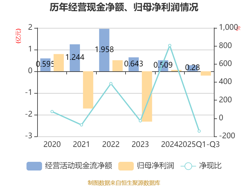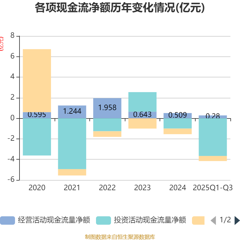 2025年前三季度,公司经营活动现金流净额为2801.12万元,同比增长8.71%;筹资活动现金流净额-4928.75万元,同比增加103.74万元;投资活动现金流净额-3.66亿元,上年同期为-3.9亿元。