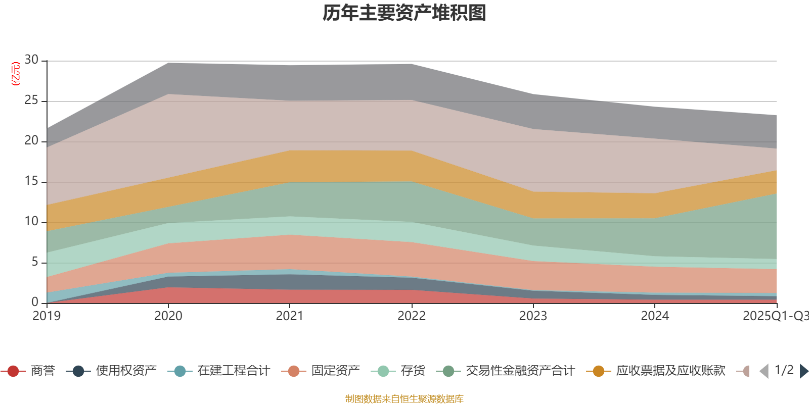 资产重大变化方面,截至2025年三季度末,公司货币资金较上年末减少60.29%,占公司总资产比重下降16.28个百分点;交易性金融资产合计较上年末增加72.56%,占公司总资产比重上升15.55个百分点;其他非流动金融资产较上年末增加65.02%,占公司总资产比重上升1.32个百分点;使用权资产较上年末减少27.84%,占公司总资产比重下降0.61个百分点。