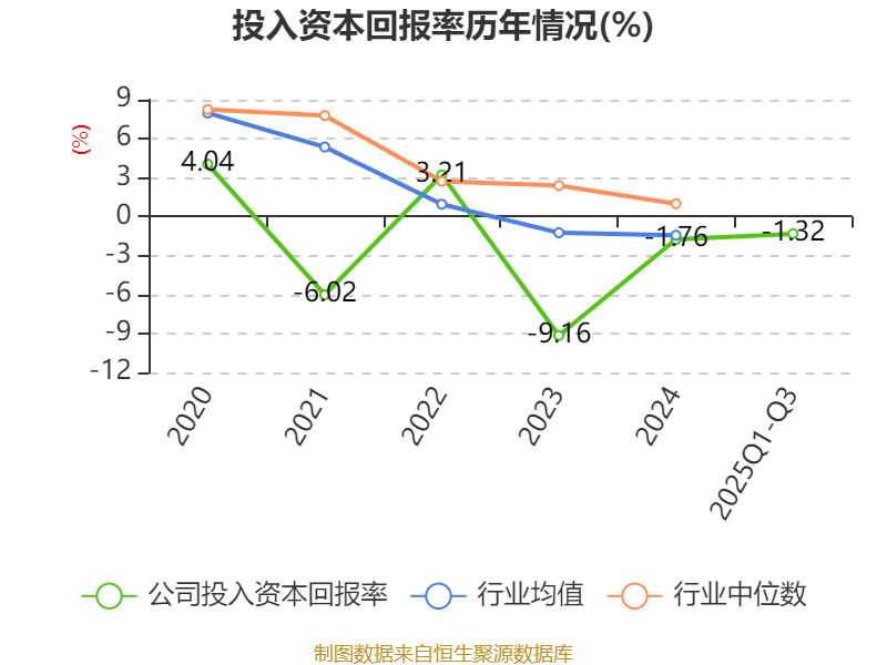 盈利能力方面, 2025年前三季度公司加权平均净资产收益率为-1.02%,同比下降3.12个百分点。公司2025年前三季度投入资本回报率为-1.32%,较上年同期下降2.87个百分点。