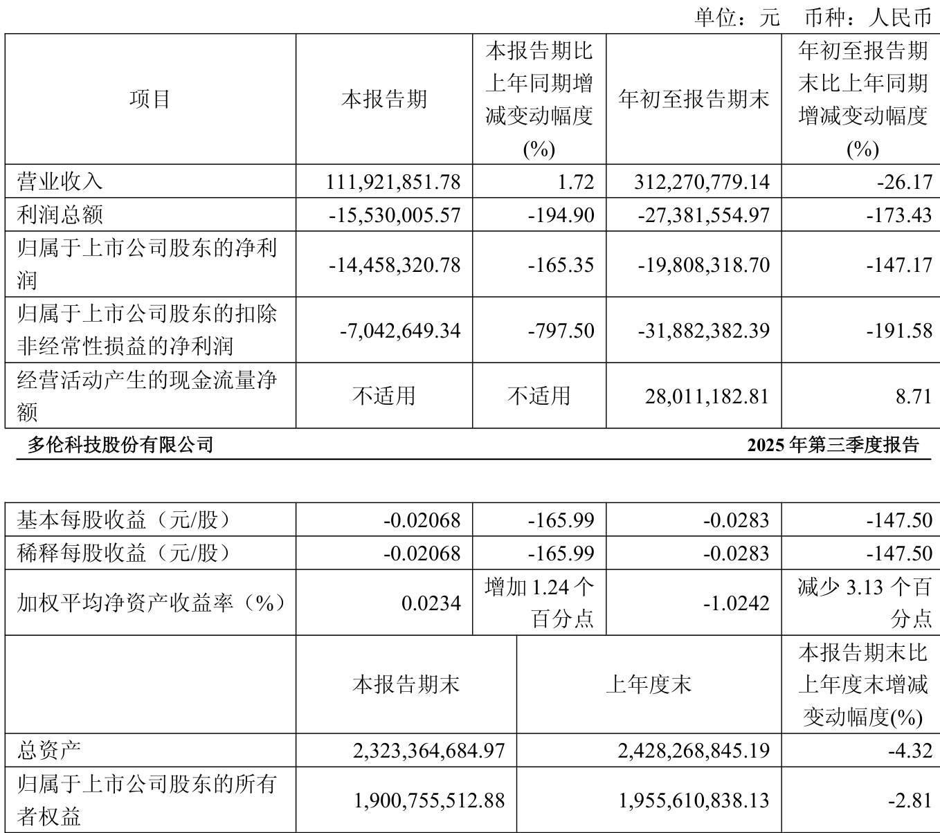 中证智能财讯多伦科技(603528)10月31日披露2025年第三季度报告。前三季度公司实现营业总收入3.12亿元,同比下降26.17%;归母净利润亏损1980.83万元,上年同期盈利4199.56万元;扣非净利润亏损3188.24万元,上年同期亏损1093.44万元;经营活动产生的现金流量净额为2801.12万元,同比增长8.71%;报告期内,多伦科技基本每股收益为-0.0283元,加权平均净资产收益率为-1.02%。
