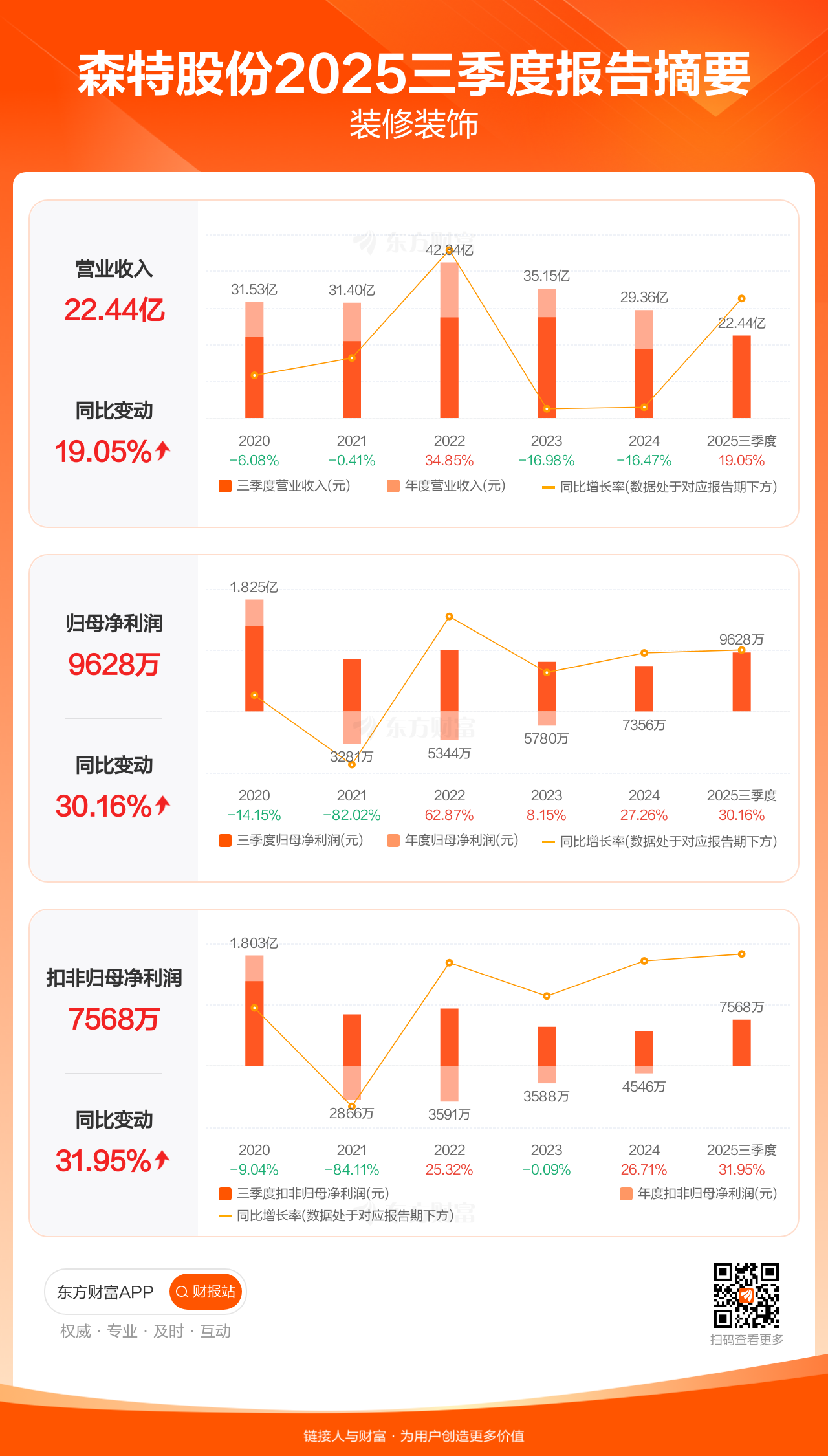 森特股份10月31日发布2025年三季报显示,公司前三季实现营业收入22.44亿元,同比增长19.05%;归母净利润9627.75万元,同比增长30.16%;扣非归母净利润7568.18万元,同比增长31.95%。