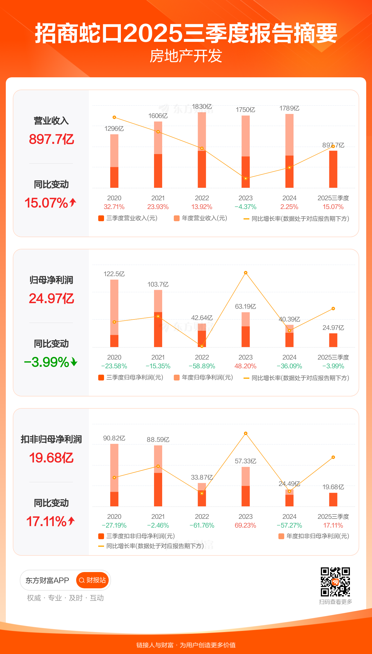 招商蛇口10月31日发布2025年三季报显示,公司前三季实现营业收入897.66亿元,同比增长15.07%;归母净利润24.97亿元,同比下滑3.99%;扣非归母净利润19.68亿元,同比增长17.11%。
