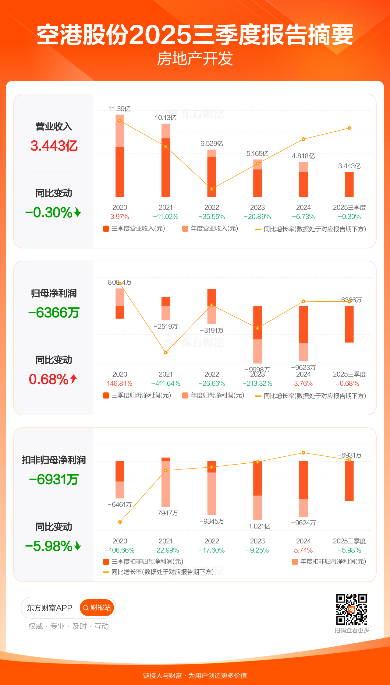 空港股份10月31日发布2025年三季报显示,公司前三季实现营业收入3.44亿元,同比下滑0.30%;归母净利润-6365.52万元;扣非归母净利润-6930.92万元。