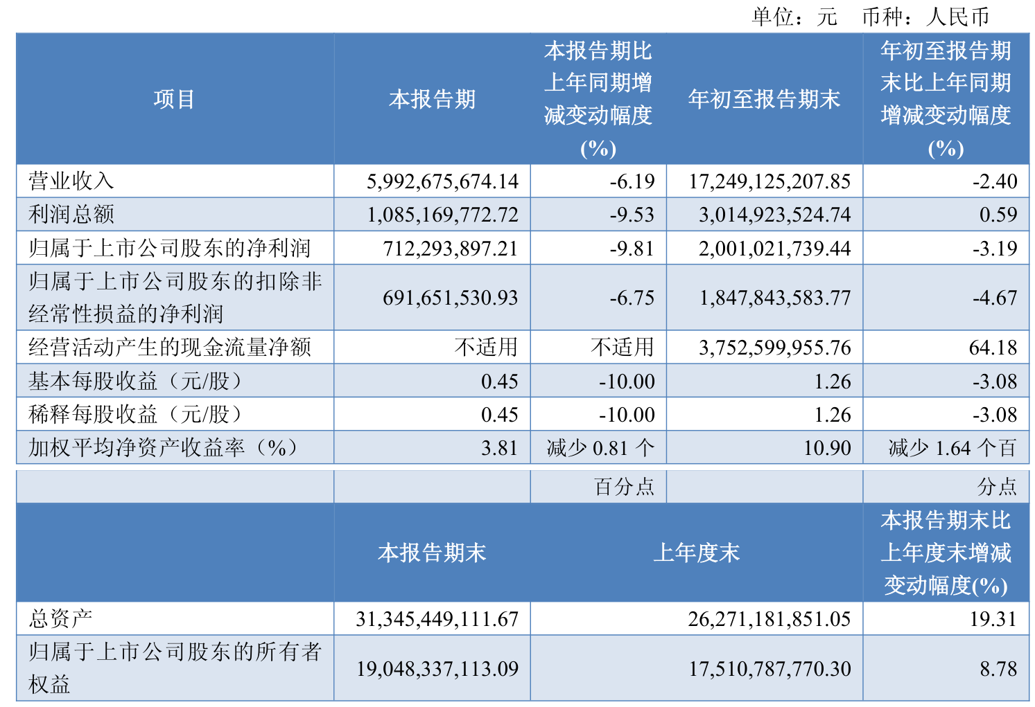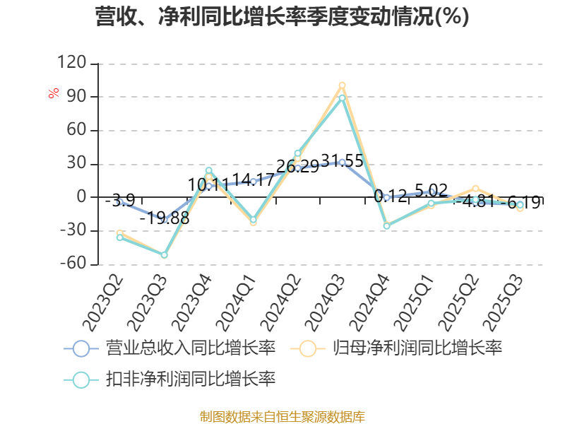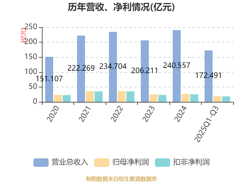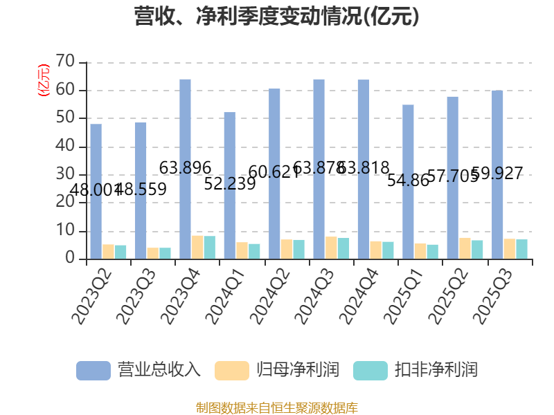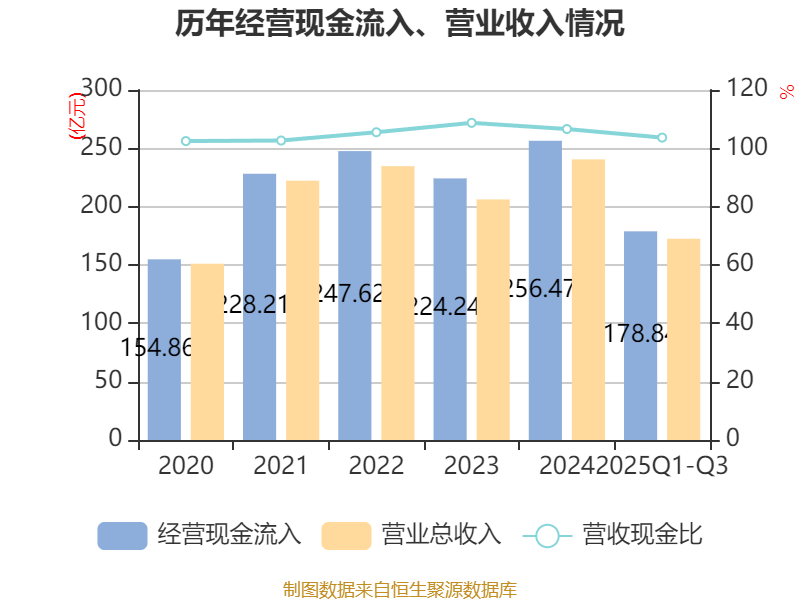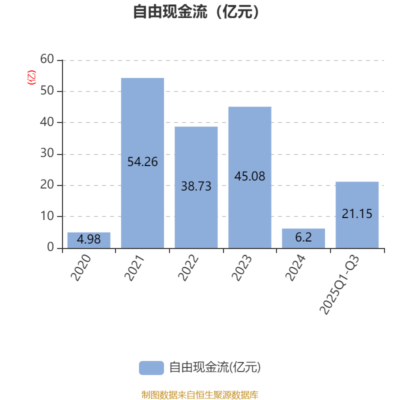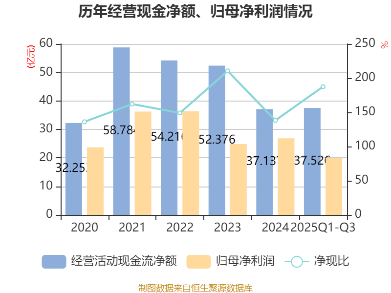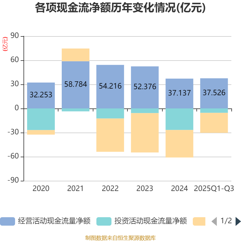 2025年前三季度,公司经营活动现金流净额为37.53亿元,同比增长64.18%;筹资活动现金流净额-24.87亿元,同比减少4.07亿元;投资活动现金流净额-5.48亿元,上年同期为-1.96亿元。