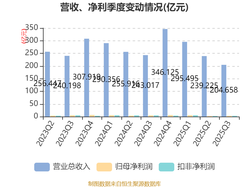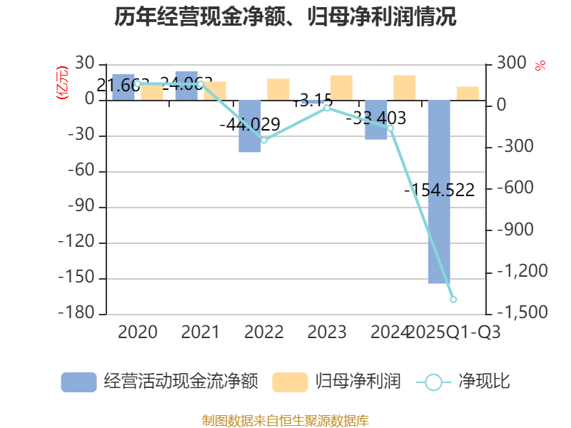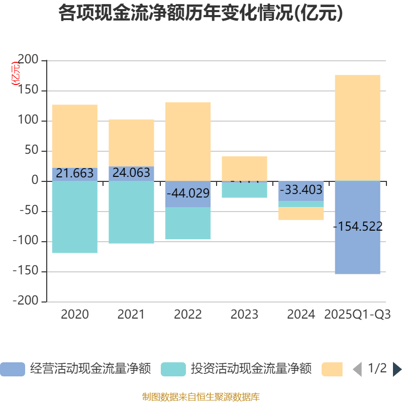 2025年前三季度,公司经营活动现金流净额为-154.52亿元,同比减少17.91亿元;筹资活动现金流净额174.9亿元,同比增加99.68亿元;投资活动现金流净额7160.23万元,上年同期为-8.28亿元。