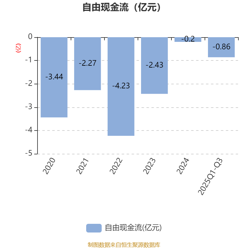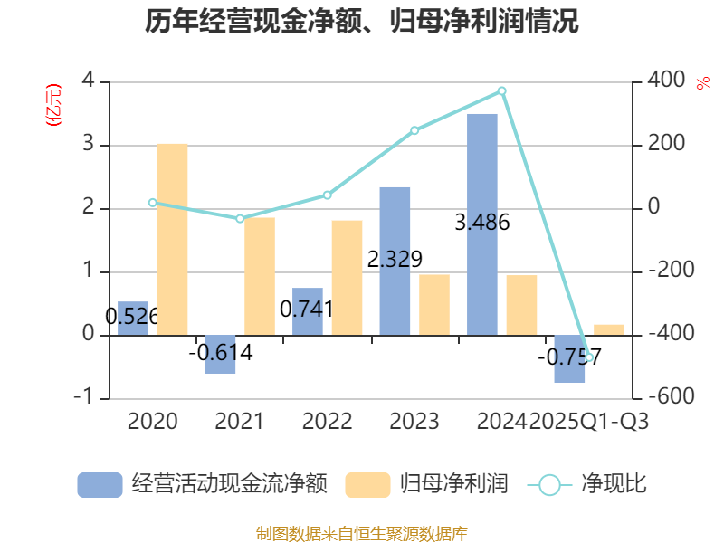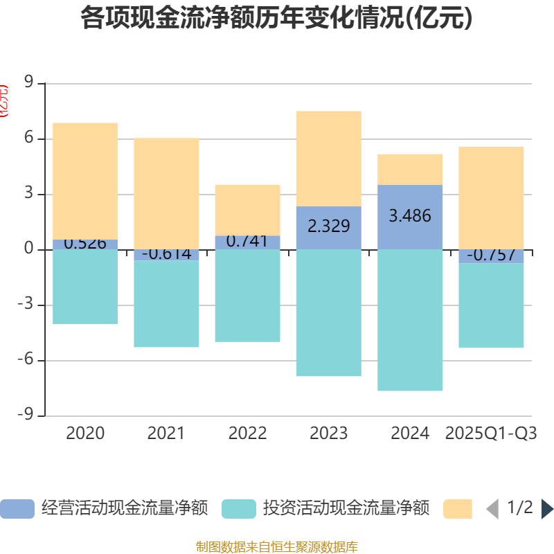 2025年前三季度,公司经营活动现金流净额为-7568.19万元,同比减少1.96亿元;筹资活动现金流净额5.55亿元,同比增加3.73亿元;投资活动现金流净额-4.57亿元,上年同期为-3.58亿元。