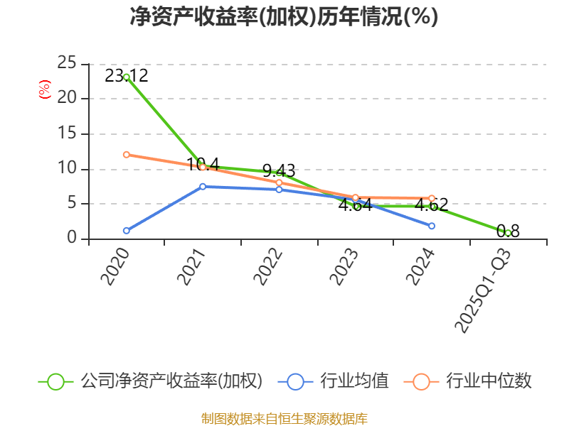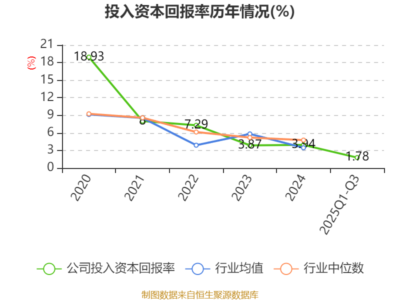 盈利能力方面, 2025年前三季度公司加权平均净资产收益率为0.8%,同比下降4.14个百分点。公司2025年前三季度投入资本回报率为1.78%,较上年同期下降1.73个百分点。