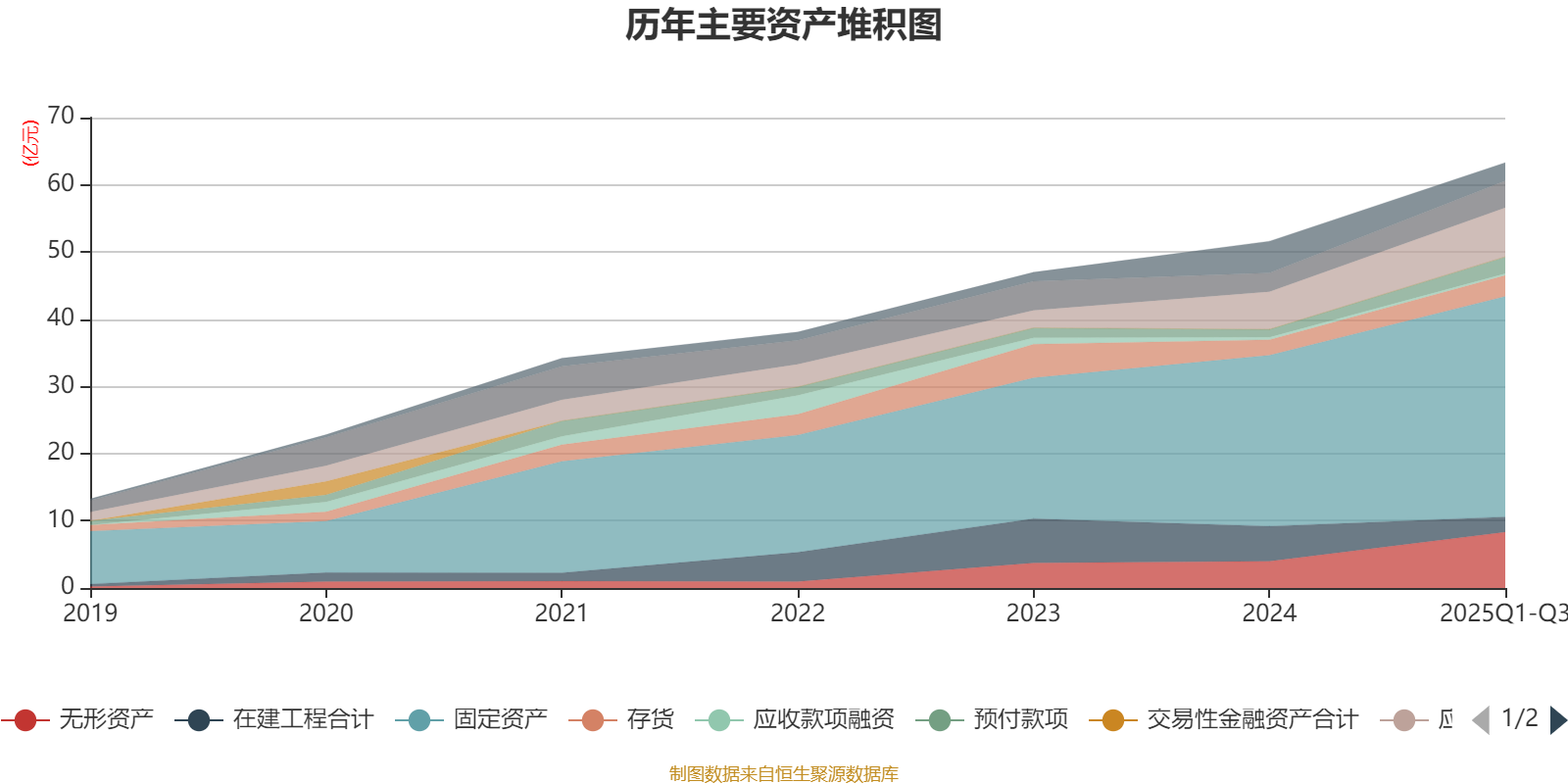 资产重大变化方面,截至2025年三季度末,公司在建工程合计较上年末减少56.15%,占公司总资产比重下降6.51个百分点;无形资产较上年末增加108.93%,占公司总资产比重上升5.41个百分点;其他非流动资产较上年末减少88.78%,占公司总资产比重下降3.85个百分点;其他应收款(含利息和股利)较上年末减少94.34%,占公司总资产比重下降2.6个百分点。
