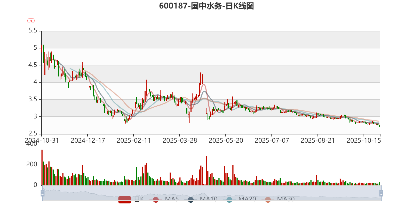 中证智能财讯国中水务(600187)10月31日披露2025年第三季度报告。前三季度公司实现营业总收入1.32亿元,同比增长5.53%;归母净利润亏损1614.02万元,上年同期盈利899.79万元;扣非净利润亏损1893万元,上年同期盈利236.66万元;经营活动产生的现金流量净额为-1052.52万元,上年同期为-4176.73万元;报告期内,国中水务基本每股收益为-0.01元,加权平均净资产收益率为-0.51%。