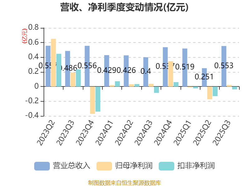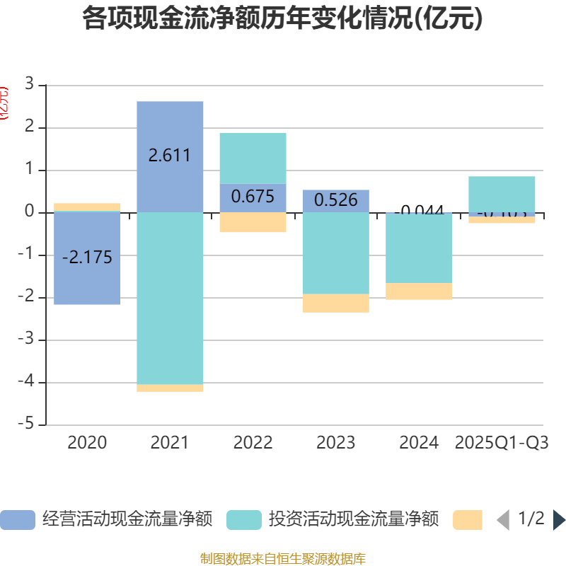 2025年前三季度,公司经营活动现金流净额为-1052.52万元,同比增加3124.21万元;筹资活动现金流净额-1510.83万元,同比增加1032.96万元;投资活动现金流净额8447.48万元,上年同期为-9169.03万元。