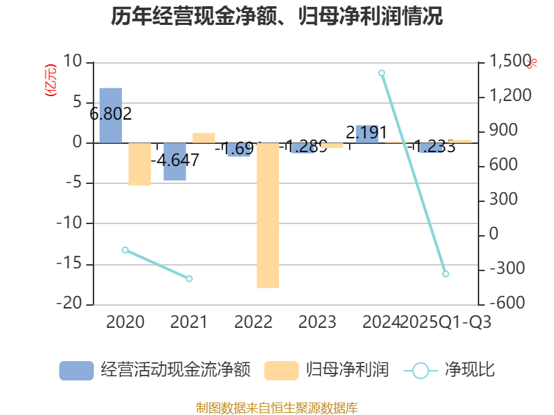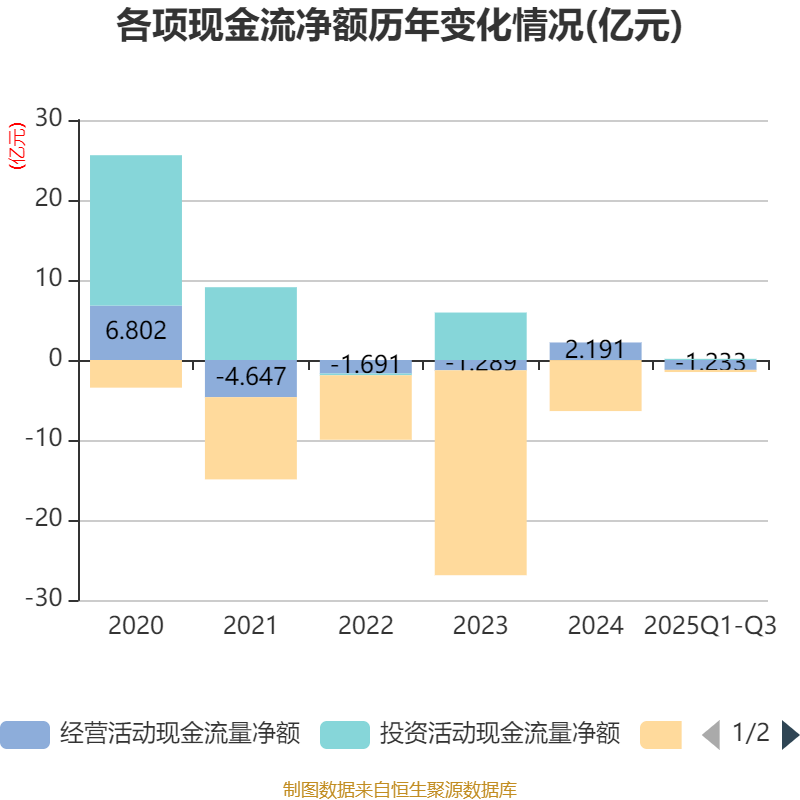 2025年前三季度,公司经营活动现金流净额为-1.23亿元,同比减少2.47亿元;筹资活动现金流净额-2724.46万元,同比增加5.98亿元;投资活动现金流净额1465.73万元,上年同期为-406.49万元。