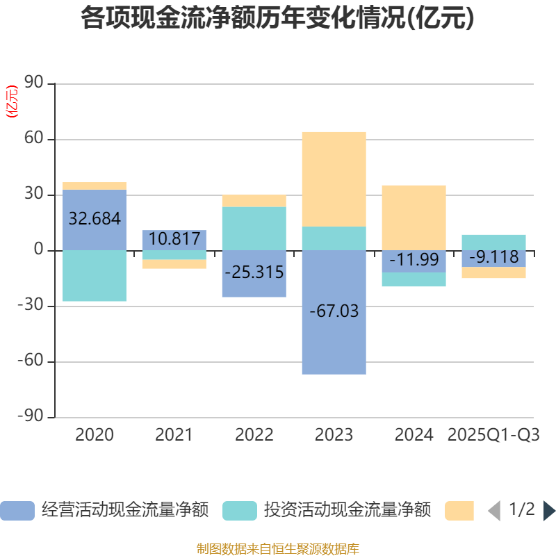 2025年前三季度,公司经营活动现金流净额为-9.12亿元,同比减少7.88亿元;筹资活动现金流净额-5.94亿元,同比减少37.25亿元;投资活动现金流净额8.3亿元,上年同期为-9.08亿元。