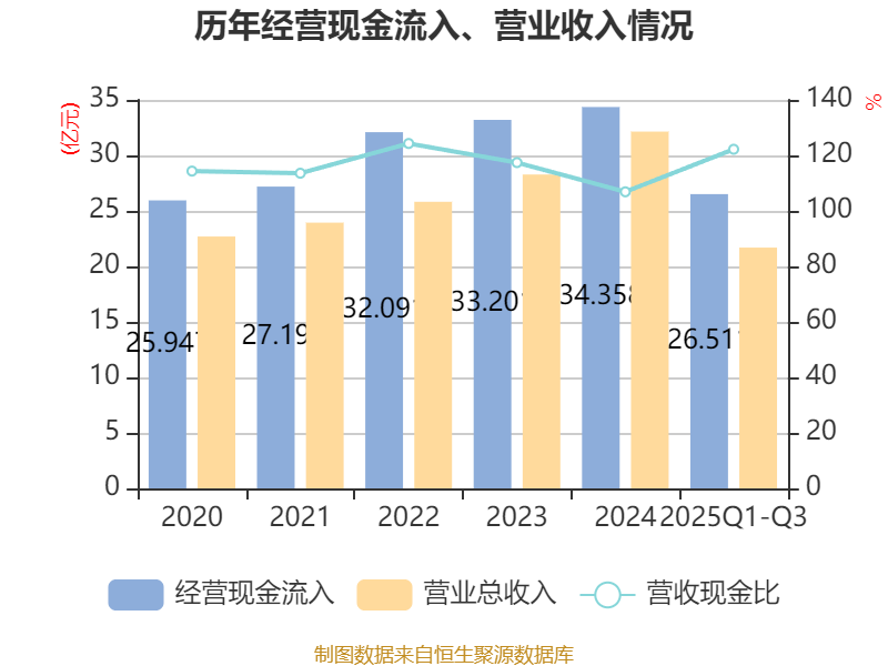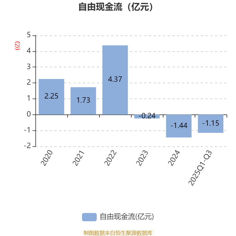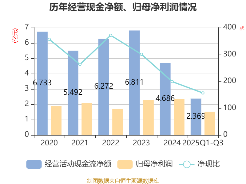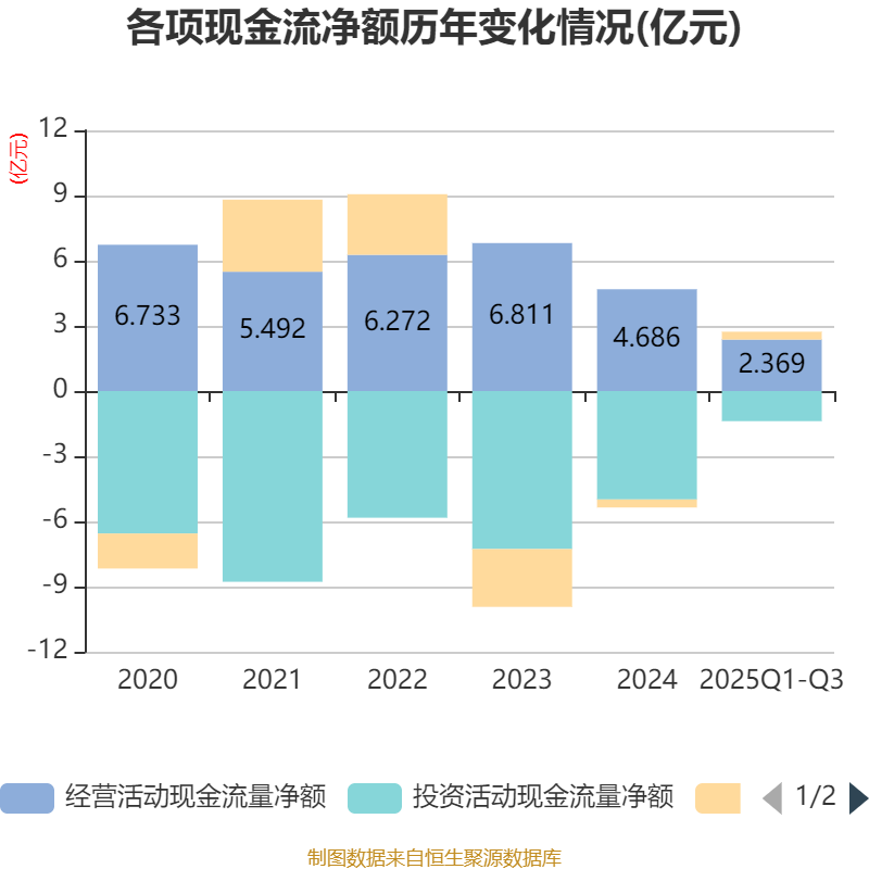 2025年前三季度,公司经营活动现金流净额为2.37亿元,同比下降44.27%;筹资活动现金流净额3622.47万元,同比增加1.14亿元;投资活动现金流净额-1.39亿元,上年同期为-3.38亿元。