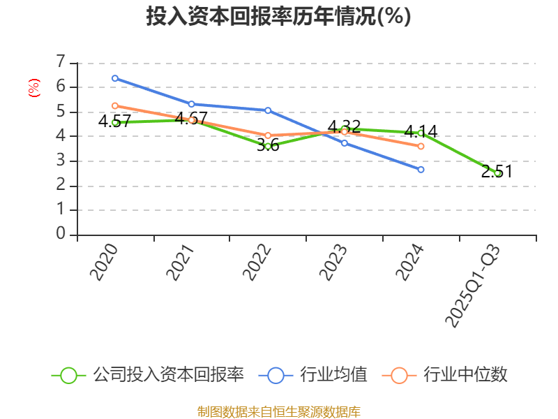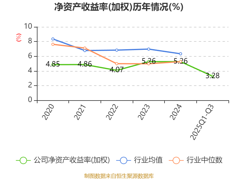 盈利能力方面, 2025年前三季度公司加权平均净资产收益率为3.28%,同比下降2.09个百分点。公司2025年前三季度投入资本回报率为2.51%,较上年同期下降1.56个百分点。