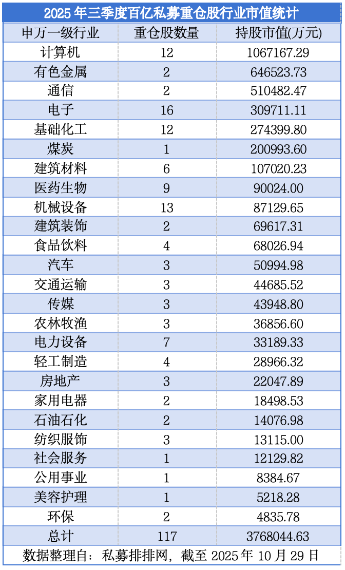 私募排排网统计数据显示,截至2025年10月29日,31家百亿私募管理人旗下产品出现在已经披露三季报的117家A股上市公司前十大流通股持有人名单中,合计持股市值高达376.80亿元。