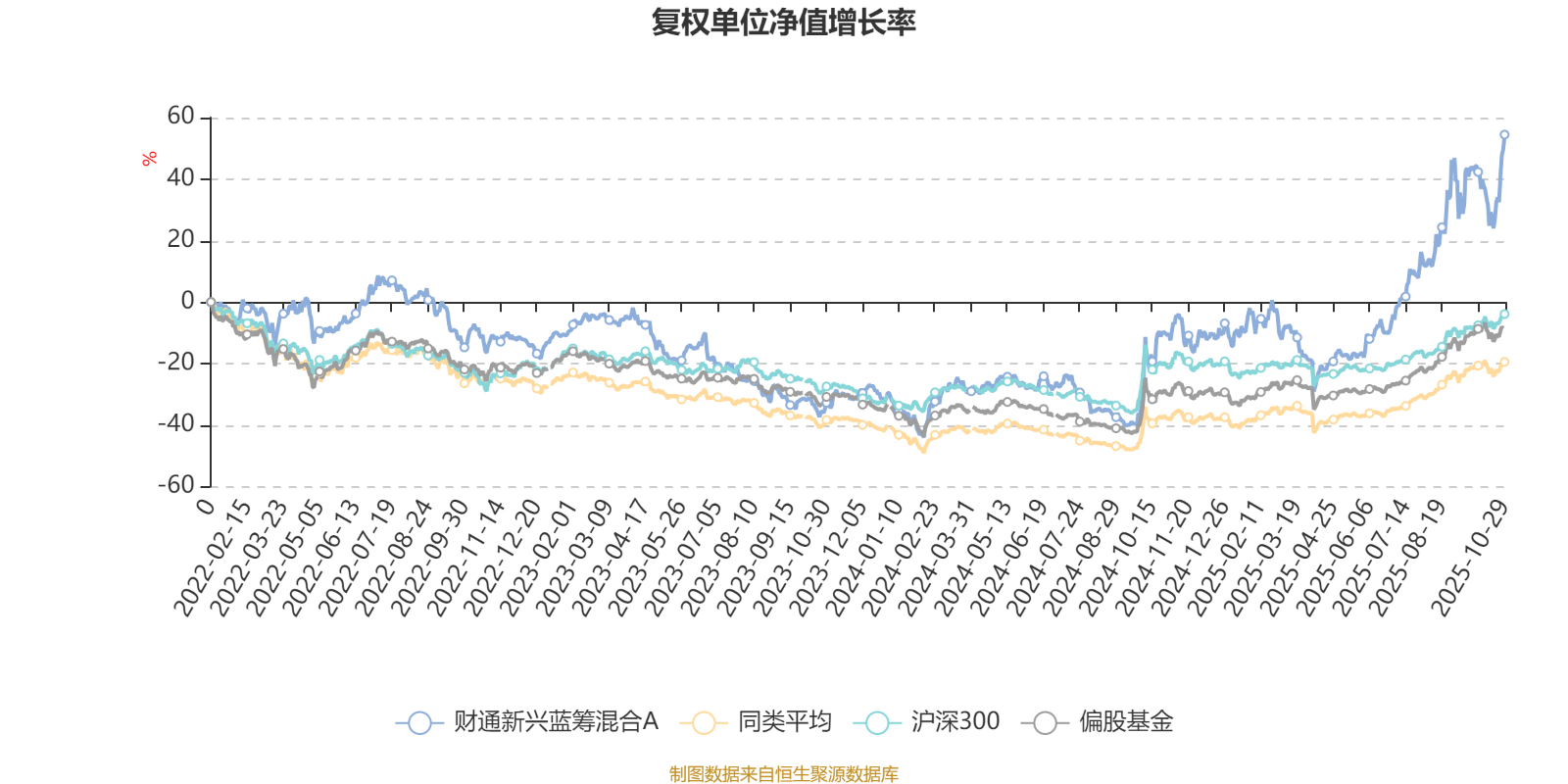 截至10月29日,财通新兴蓝筹混合A近三个月复权单位净值增长率为32.80%,位于同类可比基金62/689;近半年复权单位净值增长率为85.50%,位于同类可比基金15/688;近一年复权单位净值增长率为72.47%,位于同类可比基金27/657;近三年复权单位净值增长率为83.80%,位于同类可比基金10/364。