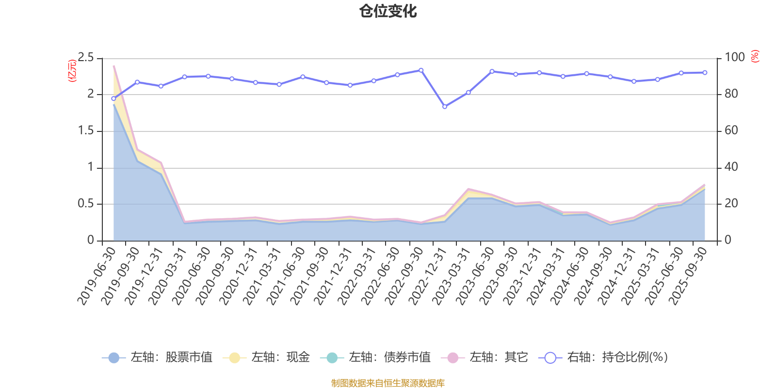 据定期报告数据统计,近三年平均股票仓位为88.49%,同类平均为83.73%。2022年三季度末基金达到93.4%的最高仓位,2022年末最低,为73.5%。