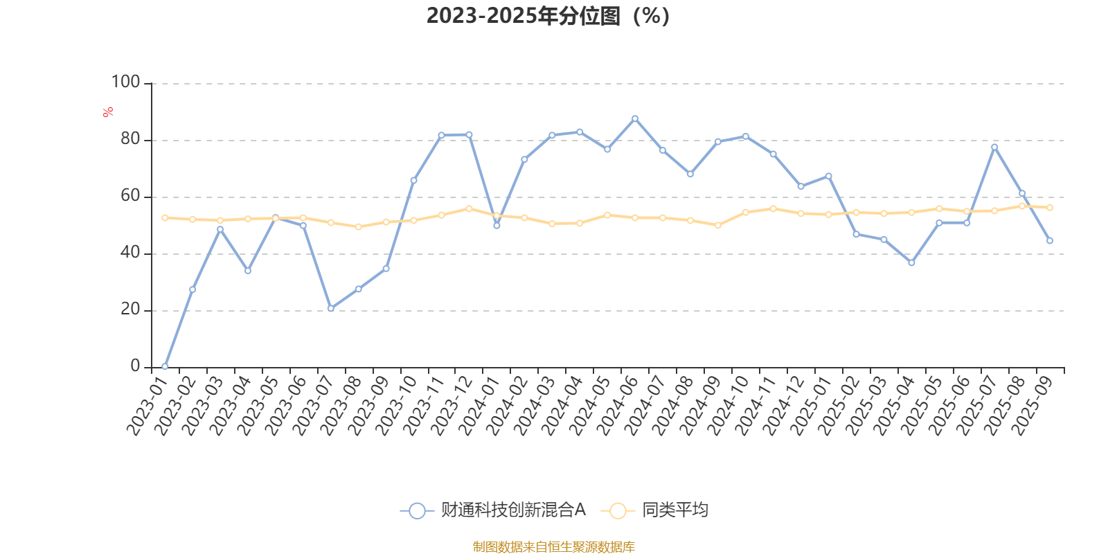 通过所选区间该基金净值增长率分位图,可以观察该基金与同类基金业绩比较情况。图为坐标原点到区间内某时点的净值增长率在同类基金中的分位数。