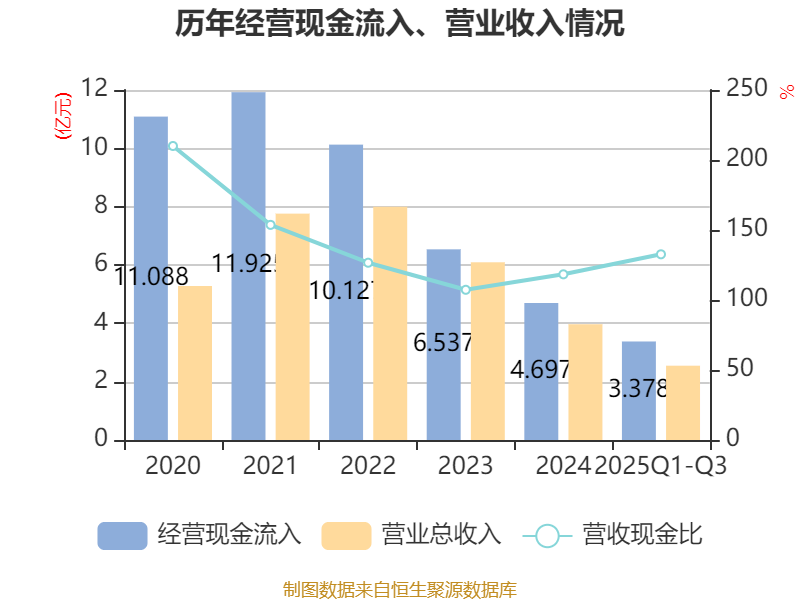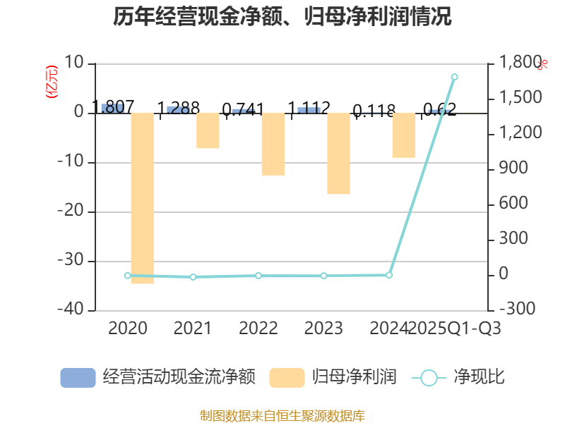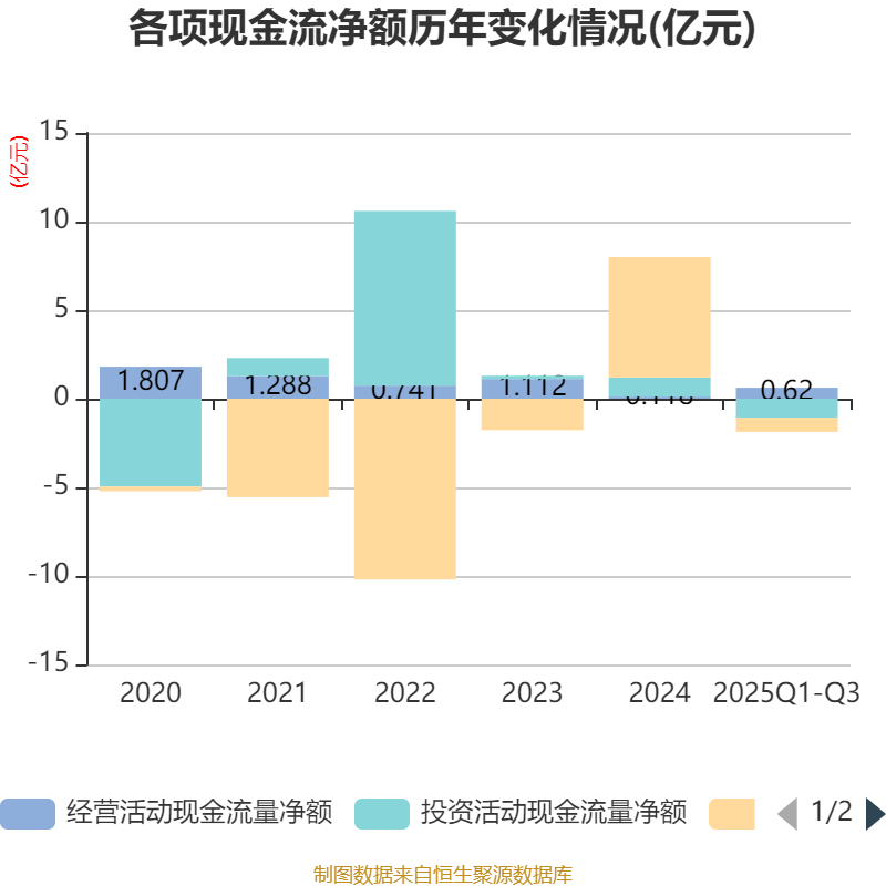 2025年前三季度,公司经营活动现金流净额为6197.63万元,同比增长122.92%;筹资活动现金流净额-7948.7万元,同比减少3411.74万元;投资活动现金流净额-1.07亿元,上年同期为4254.77万元。