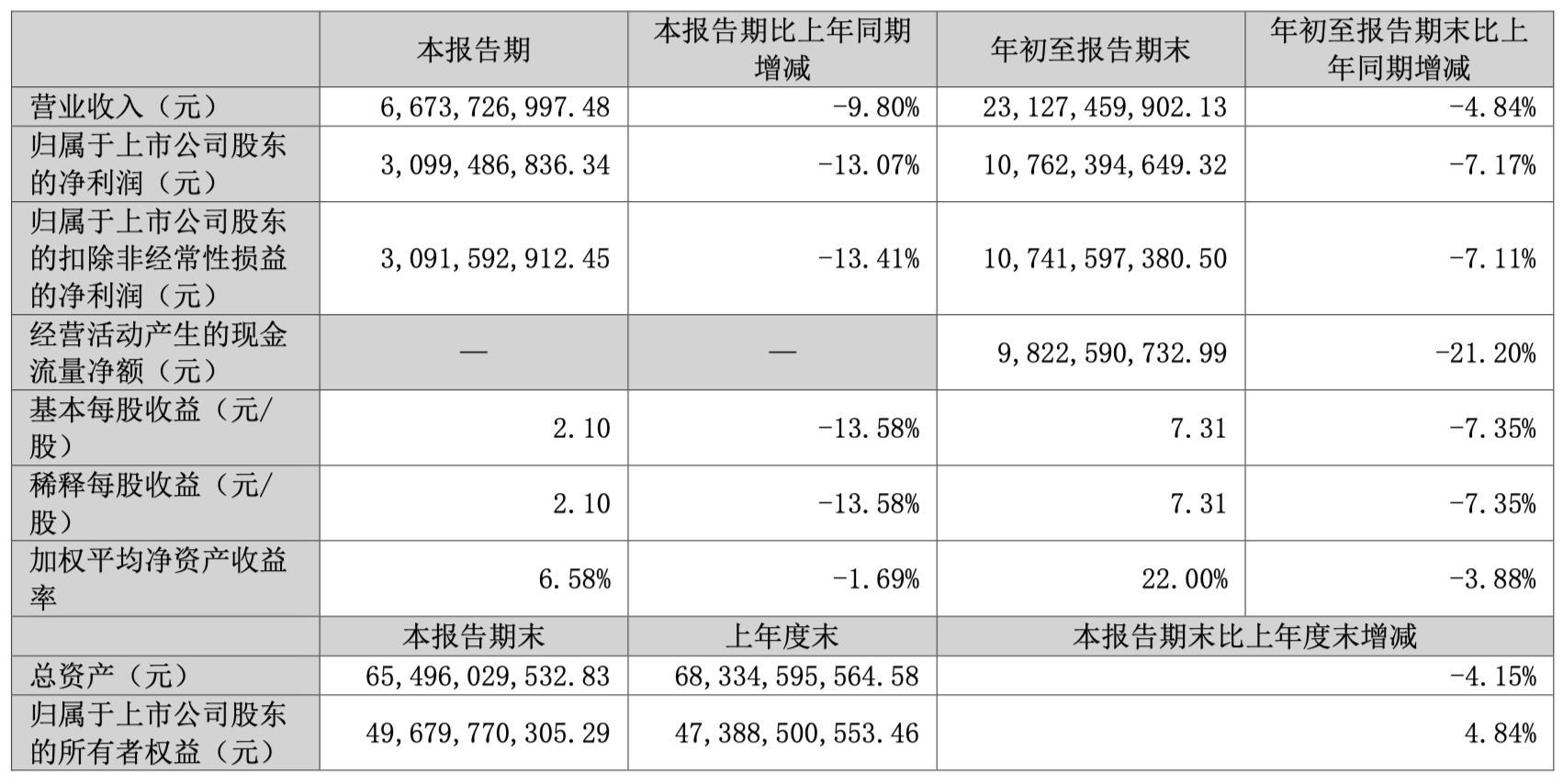 第三季度实现营业收入66.74亿元,同比下降9.80%;归母净利润30.99亿元,同比下降13.07%。